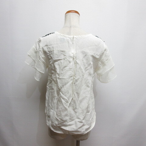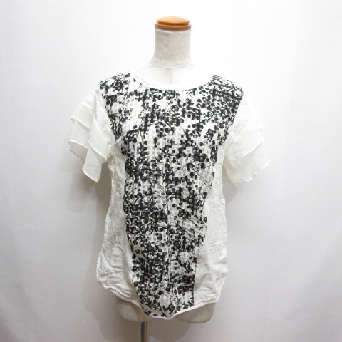 アツロウタヤマ ATSURO TAYAMA 異素材切替え 半袖 ブラウス カットソー 36 オフホワイト 麻リネン混 シフォン袖 レディース