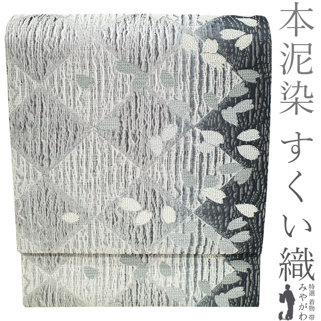袋帯 リサイクル 正絹 京都 西陣 本泥染 すくい織 銀糸 ライトグレー グレー 桜 菱格子 カジュアル 中古 仕立て上がり みやがわ sb53899
