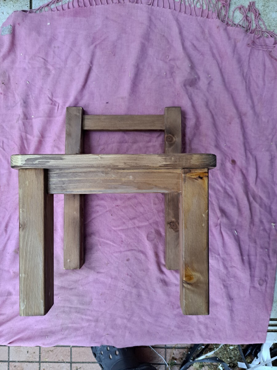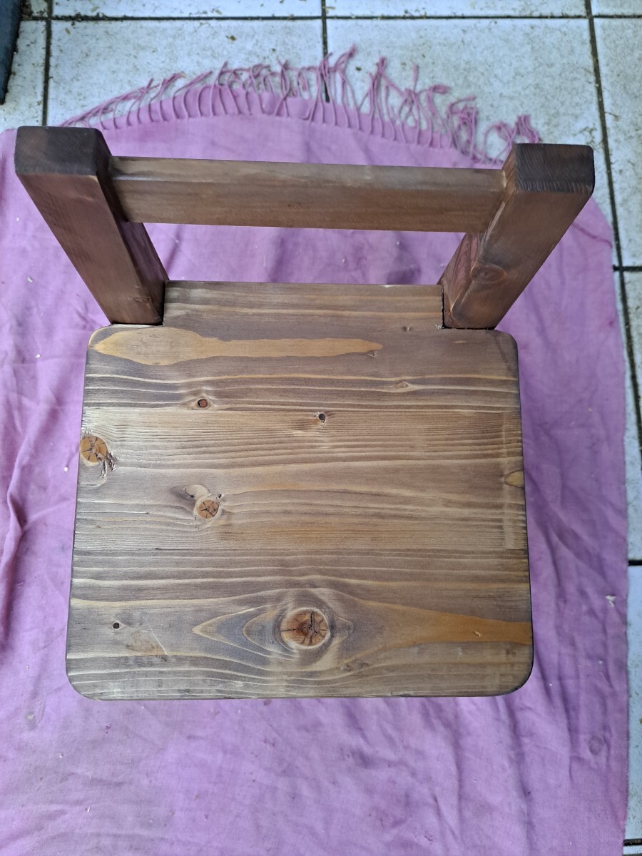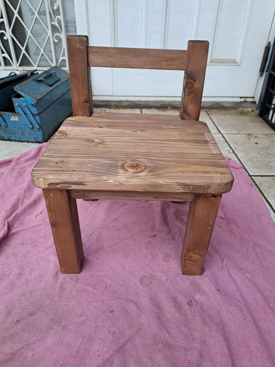 趣味で木工しています。 木材は全てホワイトウッドを使用しています。 自然素材なので節やシミやひび割れや節のパテ埋め等又趣味の手作りなので多少の傷・汚れ・隙間・磨き不足・塗装へたくそはあります。 座面は285mm×265mmで高さ200mmです。 背もたれを含めた全体の高さは340mmで奥行き280mmで横幅285mmです。(およそです) 仕上はヴィンテージ家具風にウォールナット色のステインで塗装してウレタン仕上げです。素人の作品ですが、ビスや釘等金具は一切使わず本格ほぞ組構造で作って居ますのでガッチリしていますので子供さんに安心して座ってもらえるかと思います。塗装後にガラス面でガタツキ調整していますが設置環境が変われば多少ガタツキが出るかもしれませんがその場合フェルト等張って調整してください。素人の手作り品ですので、家具屋さんで見るような高級家具と比較されては困ります。 子供椅子のほかに鉢植え・ぬいぐるみ・小物雑貨などオシャレに飾ってお楽しみください。