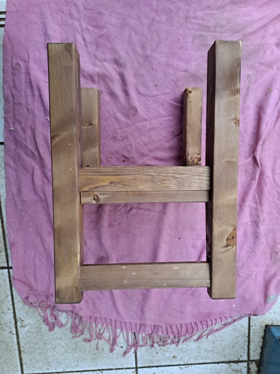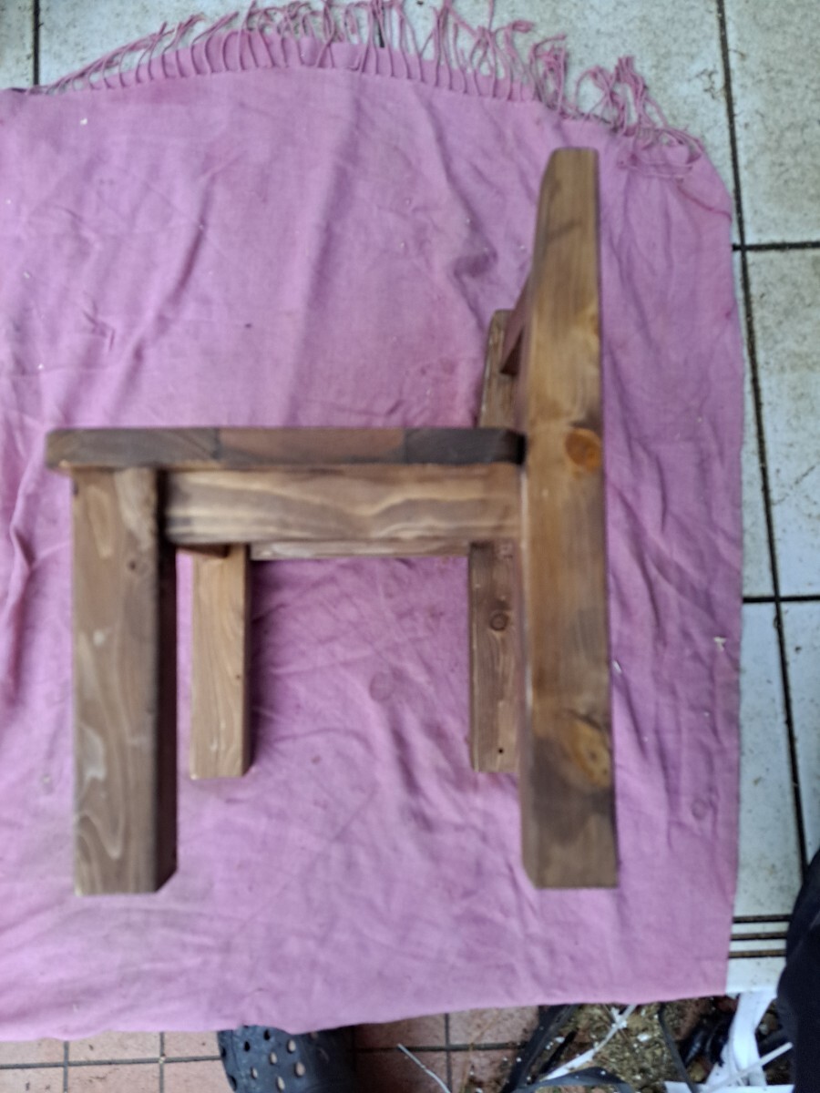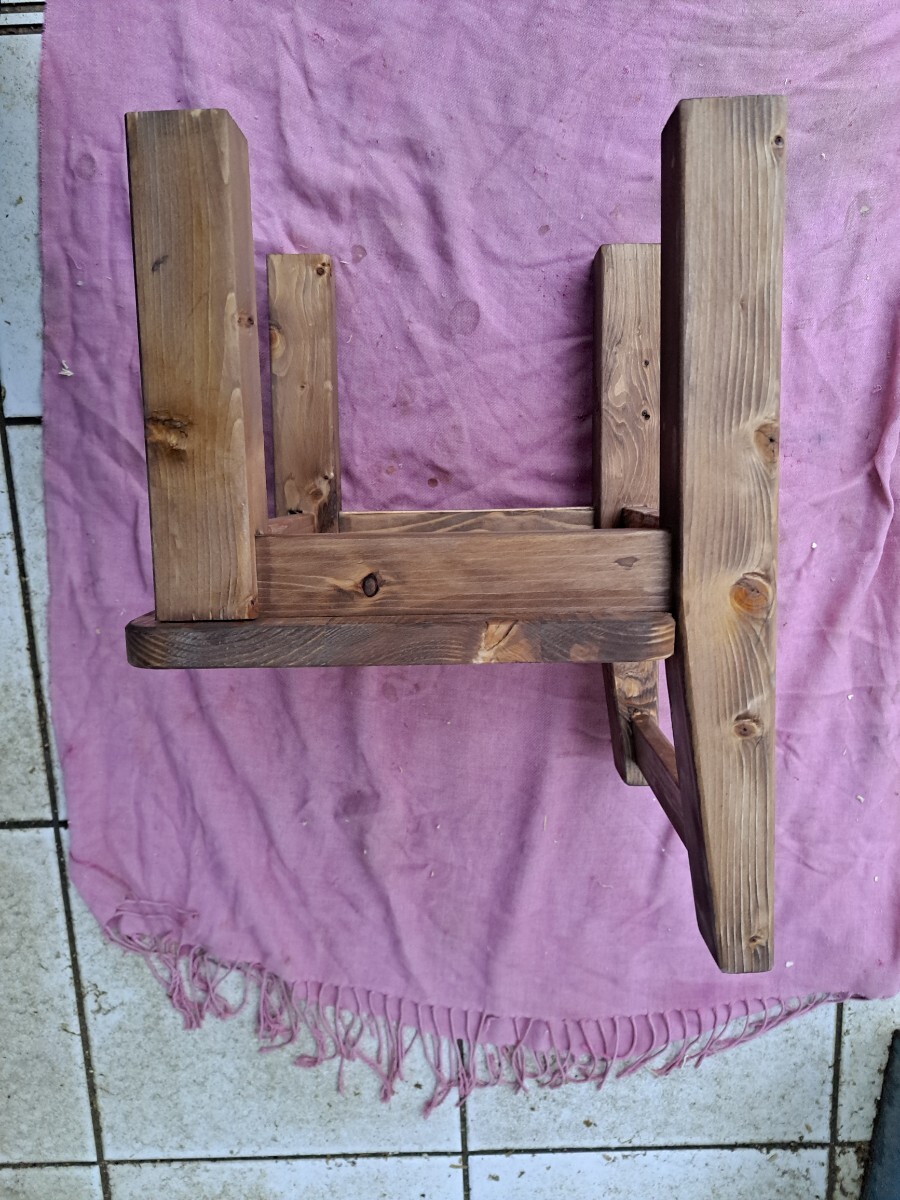 趣味で木工しています。 木材は全てホワイトウッドを使用しています。 自然素材なので節やシミやひび割れや節のパテ埋め等又趣味の手作りなので多少の傷・汚れ・隙間・磨き不足・塗装へたくそはあります。 座面は285mm×265mmで高さ200mmです。 背もたれを含めた全体の高さは340mmで奥行き280mmで横幅285mmです。(およそです) 仕上はヴィンテージ家具風にウォールナット色のステインで塗装してウレタン仕上げです。素人の作品ですが、ビスや釘等金具は一切使わず本格ほぞ組構造で作って居ますのでガッチリしていますので子供さんに安心して座ってもらえるかと思います。塗装後にガラス面でガタツキ調整していますが設置環境が変われば多少ガタツキが出るかもしれませんがその場合フェルト等張って調整してください。素人の手作り品ですので、家具屋さんで見るような高級家具と比較されては困ります。 子供椅子のほかに鉢植え・ぬいぐるみ・小物雑貨などオシャレに飾ってお楽しみください。