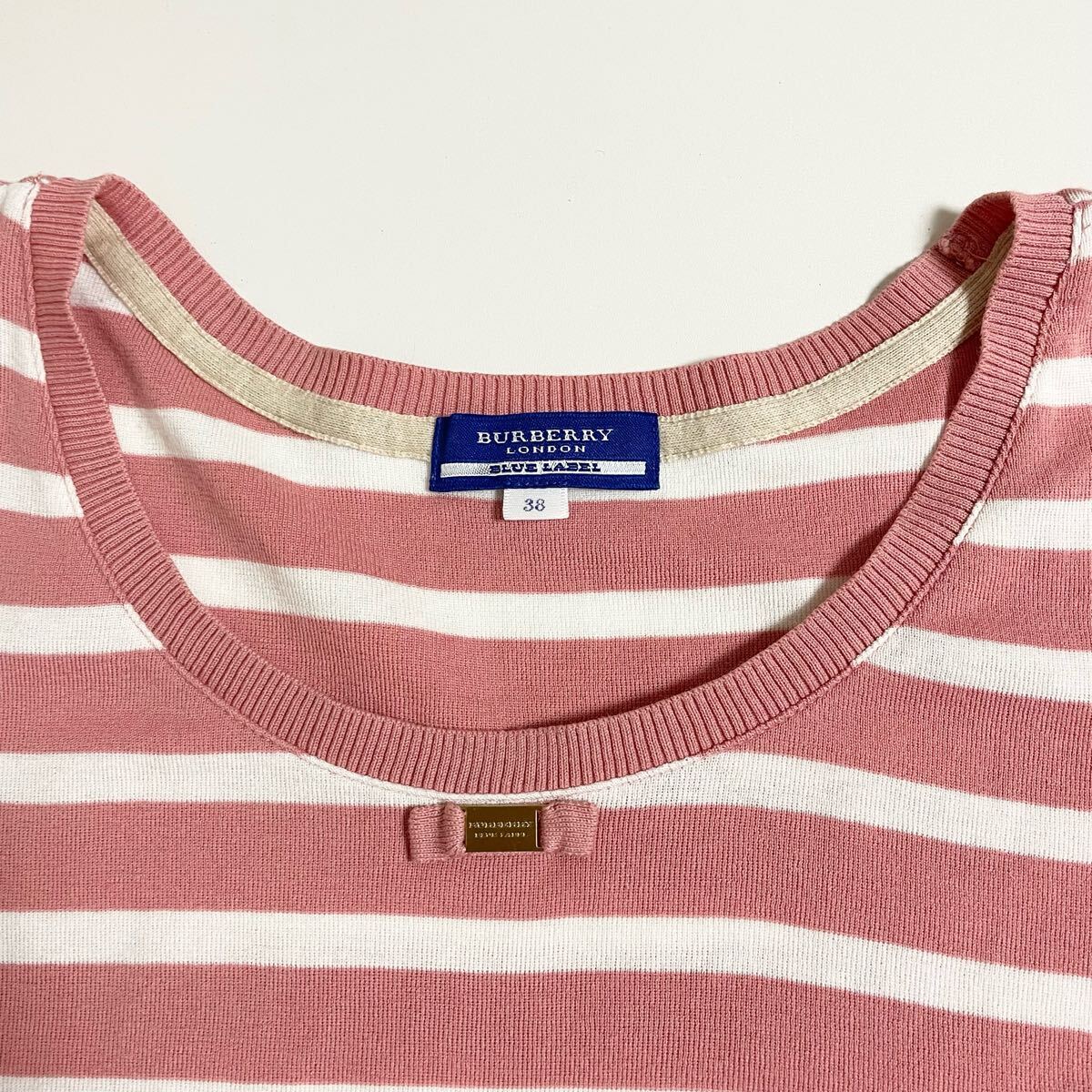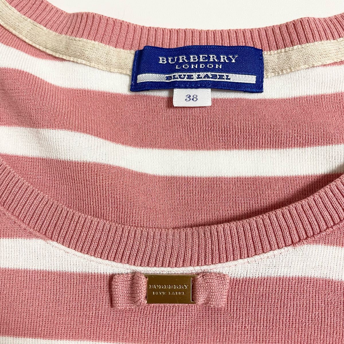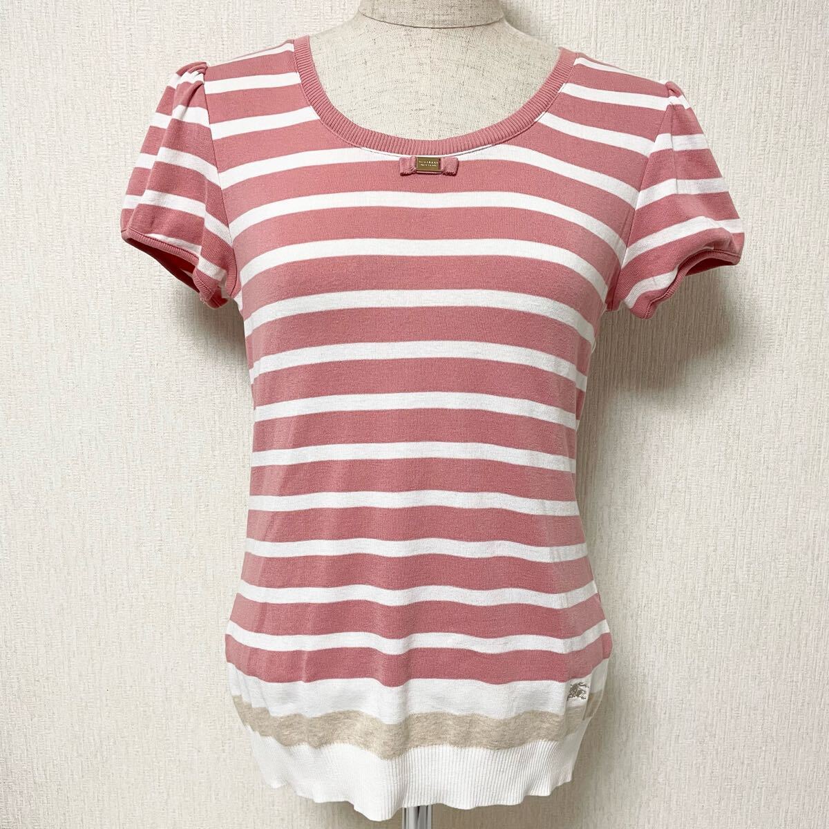即決☆BURBERRY バーバリー ブルーレーベル ボーダー コットン ニット パフスリーブ ロゴ 刺繍 半袖 カットソー トップス 38 M