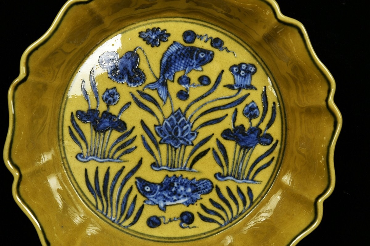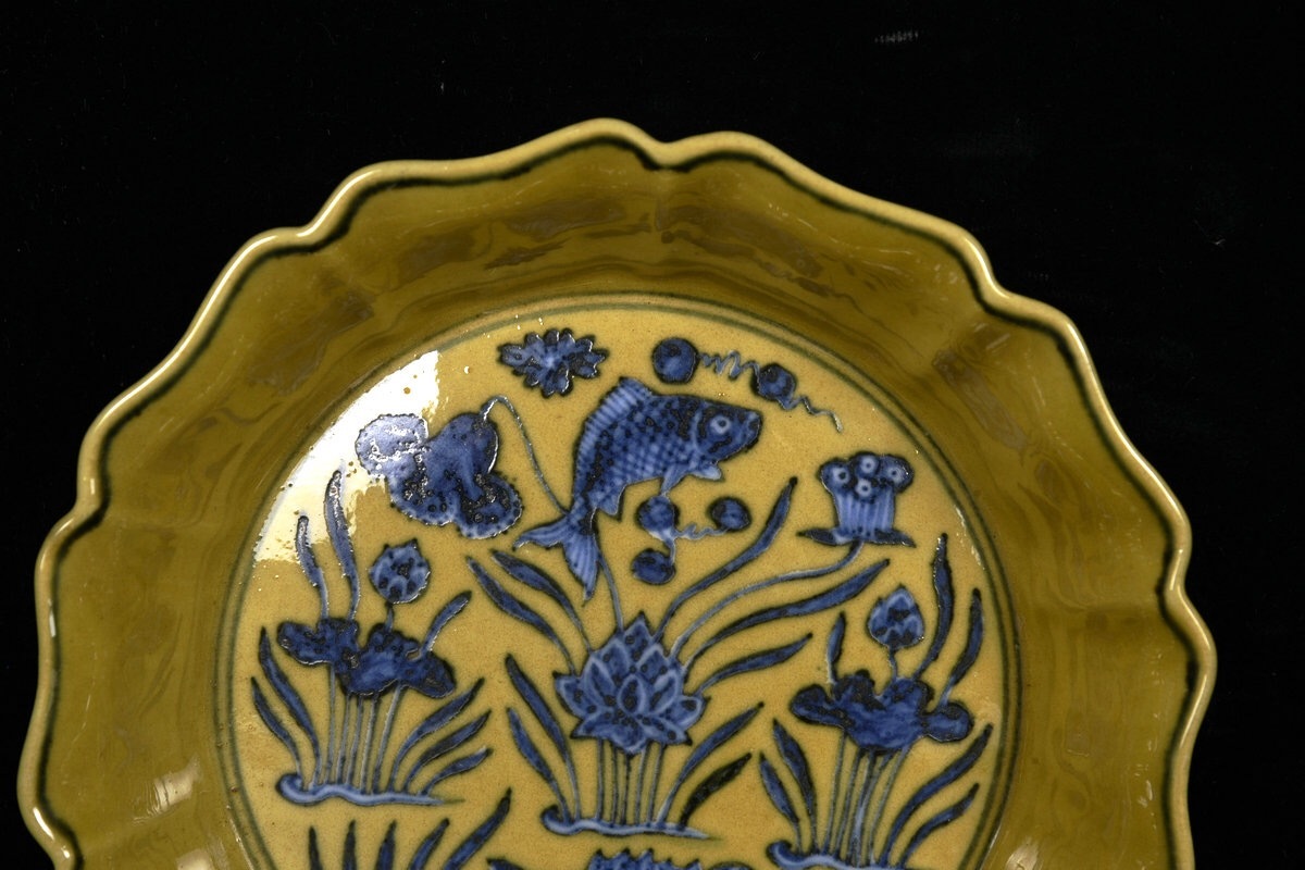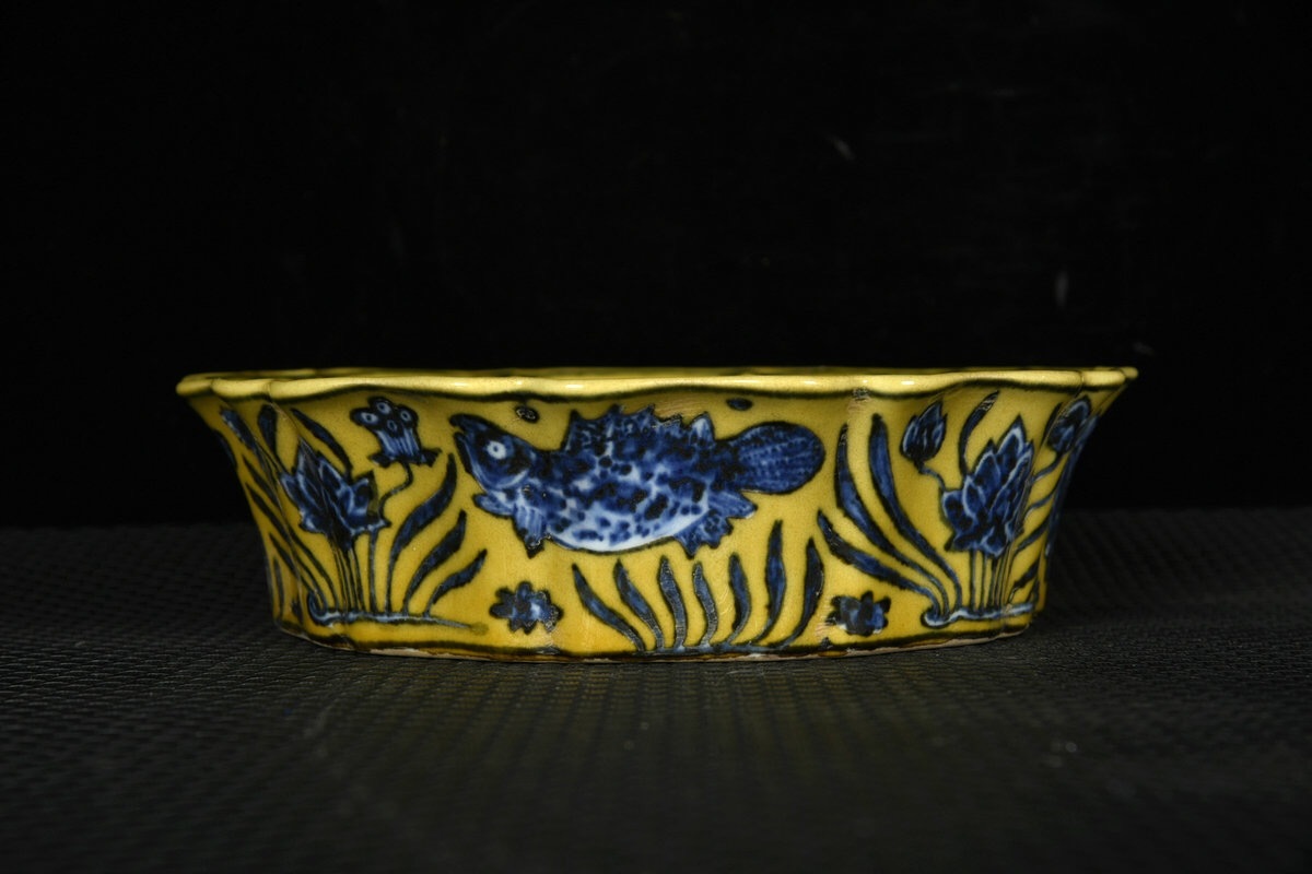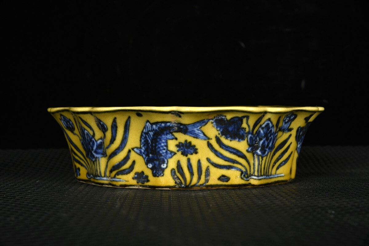 【蔵友館蔵品・明・宣德年製款・古陶瓷品・黄地・青花・魚藻紋・葵口洗】・希少珍品・置物・賞物・中国時代美術 |