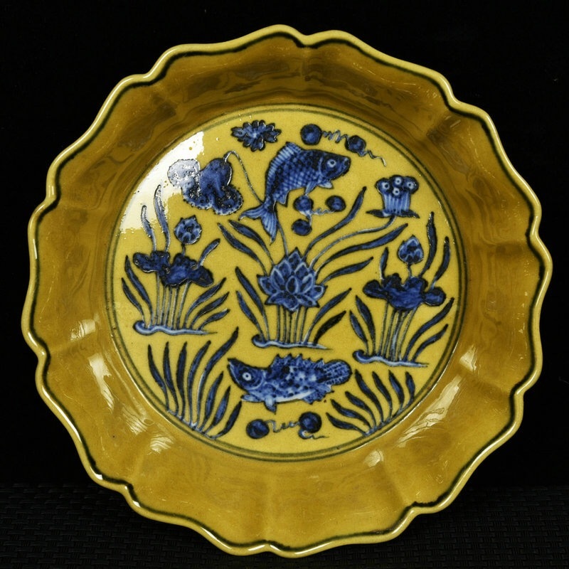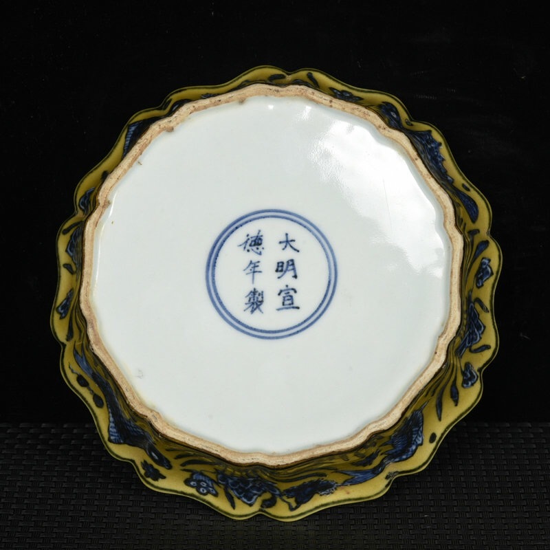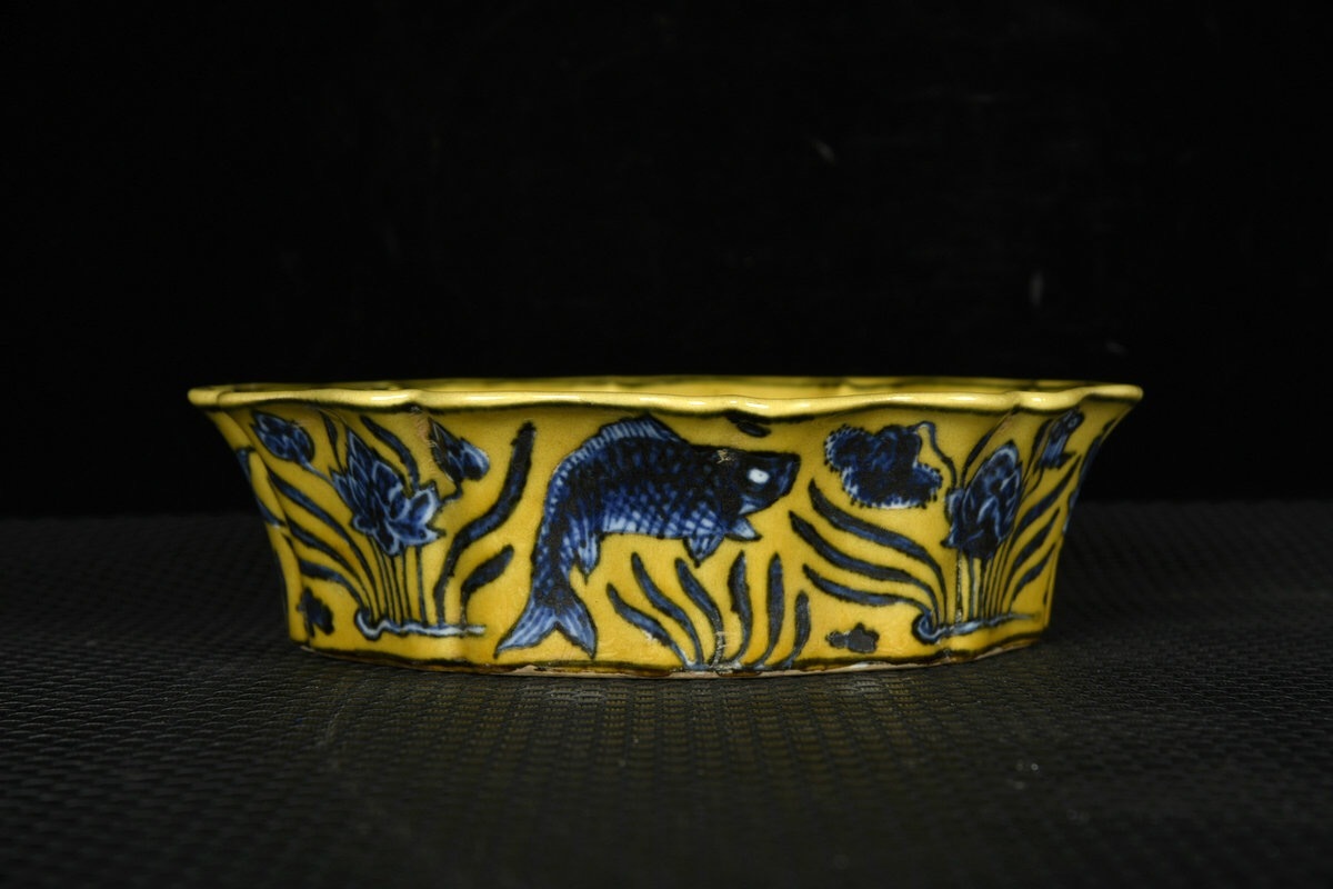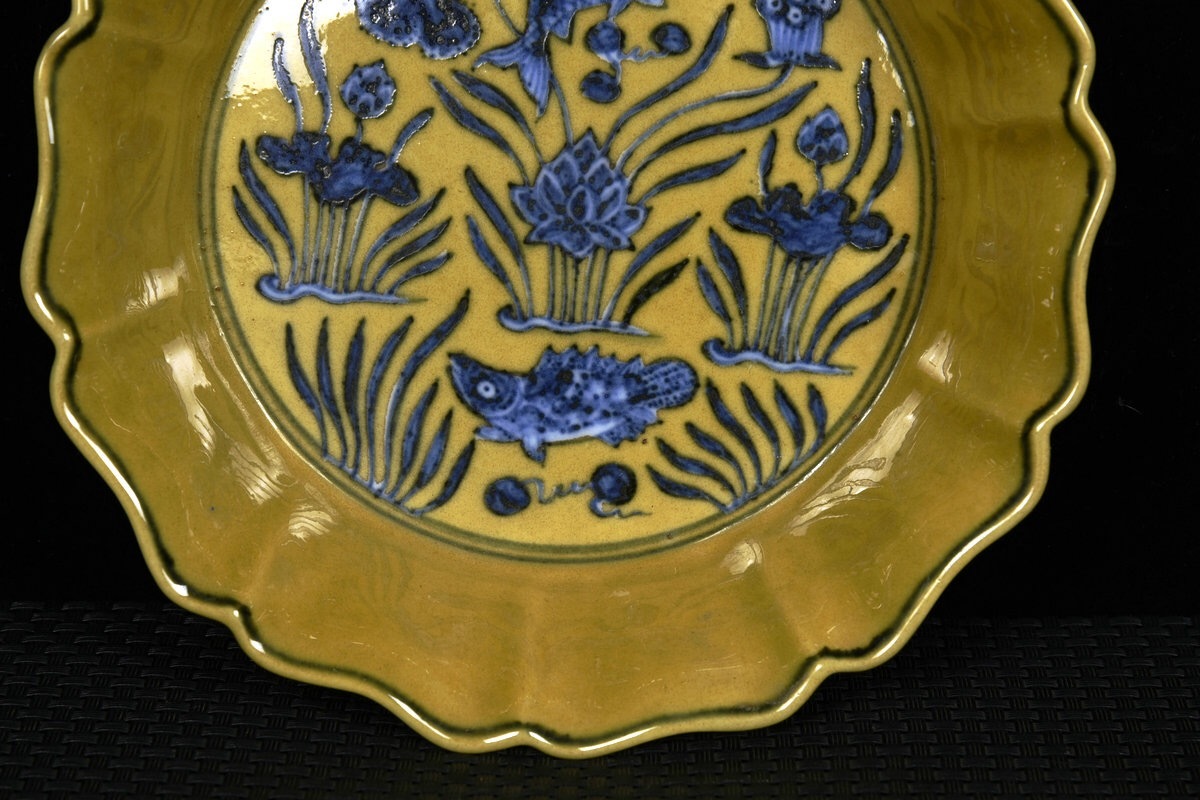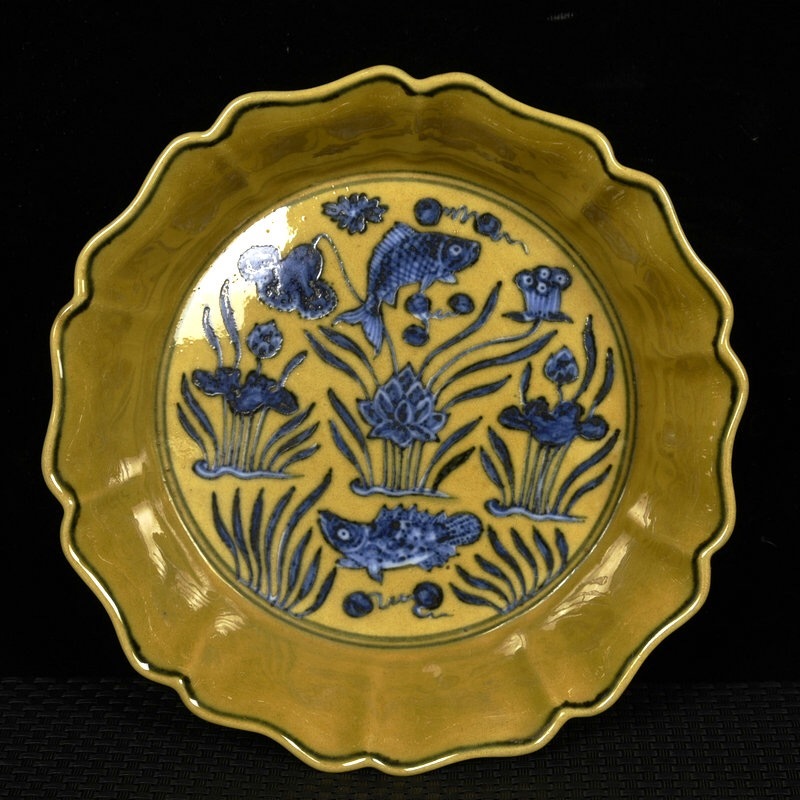 【蔵友館蔵品・明・宣德年製款・古陶瓷品・黄地・青花・魚藻紋・葵口洗】・希少珍品・置物・賞物・中国時代美術 |
