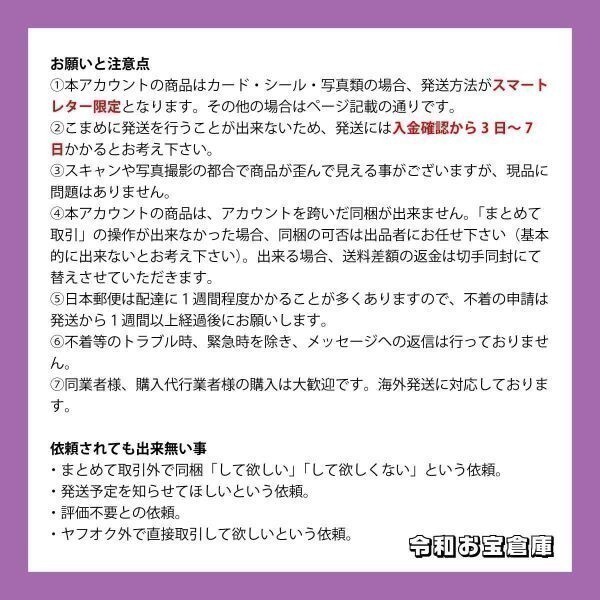 ①本アカウントの商品はカード・シール・写真類の場合、発送方法がスマートレター限定となります。その他の場合はページ記載の通りです。