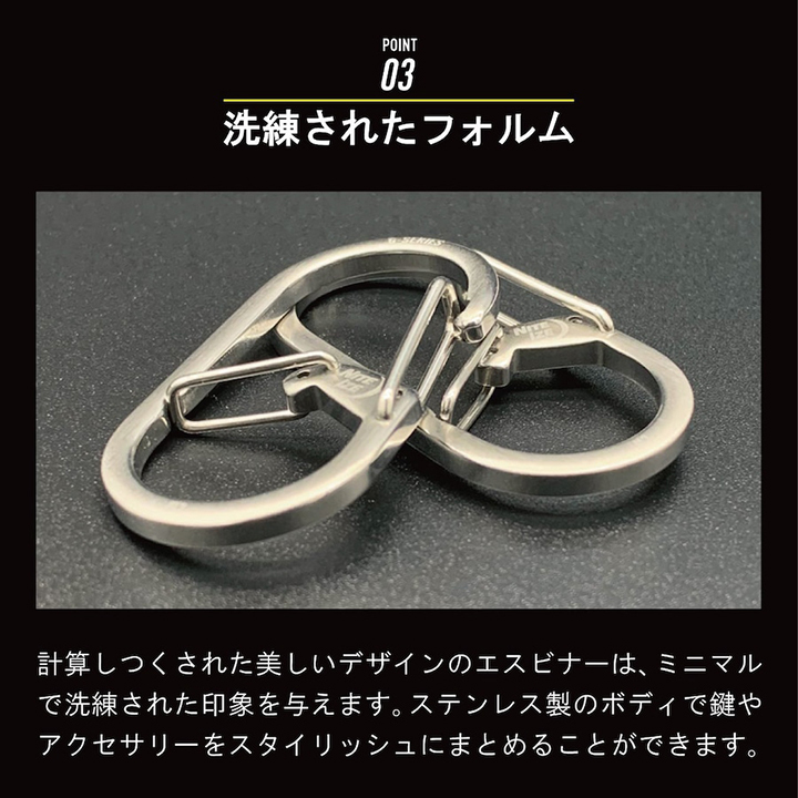 ステンレス製ボディで、鍵やキーアクセサリーをクールにまとめられます。