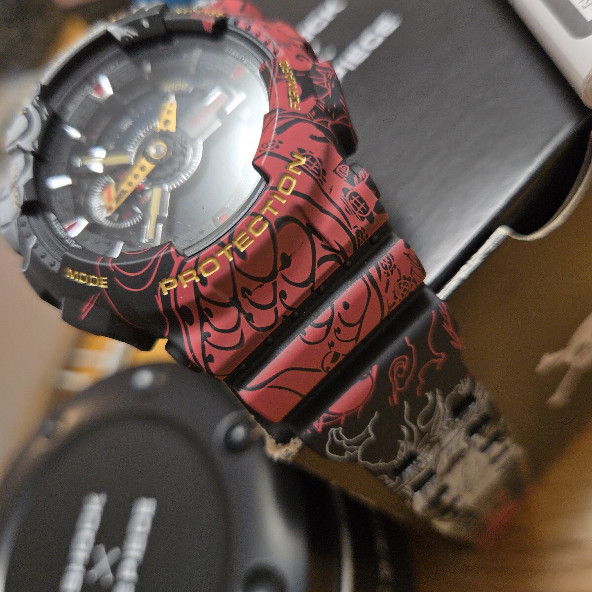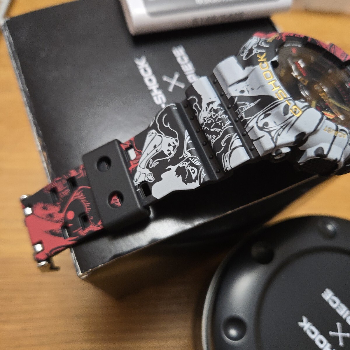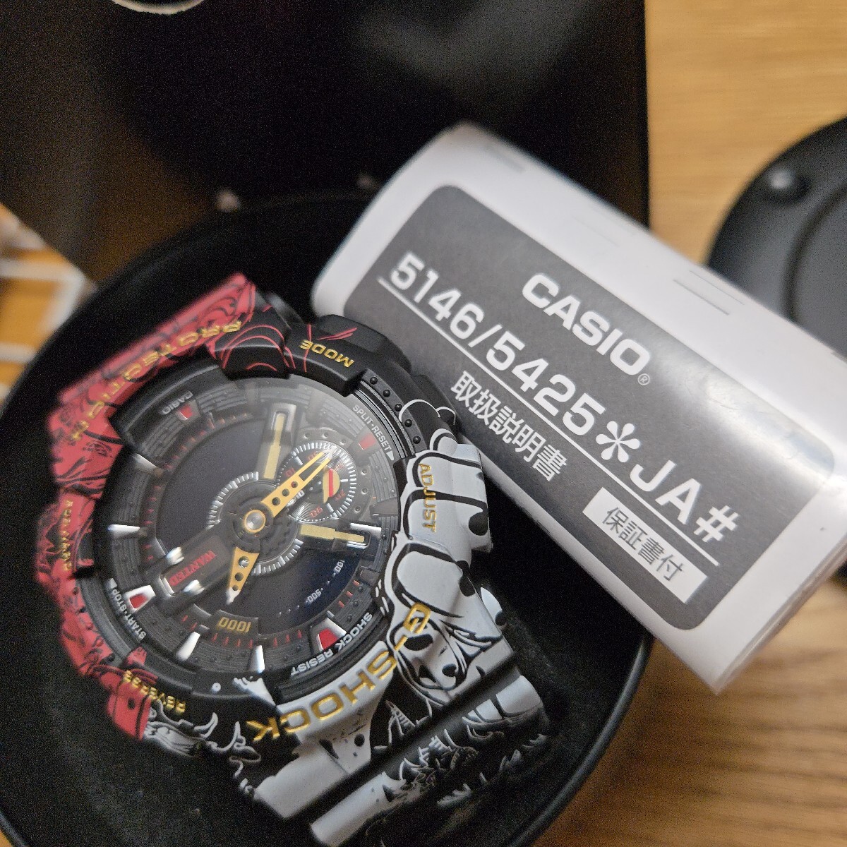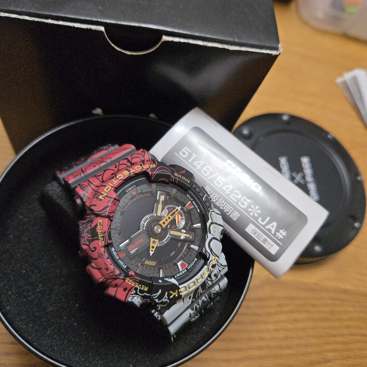 CASIO Gショック ワンピース ルフィーモデル GA-110JOP-1A4JR 新品、未使用品 ガラス、裏ブタ傷なし、 付属品、箱付、取説付 外箱バーコードシール! このモデルもコピー品がかなり出回っていますのでご注意ください! コピー品には紙の外箱がなく箱に張って有るバーコードシールが有りません! 特に箱が無い個体はコピー品の可能性が高いので安く出されても購入するのはお控えください!
