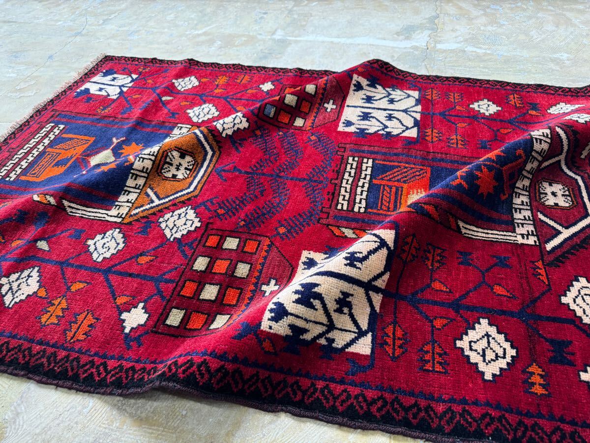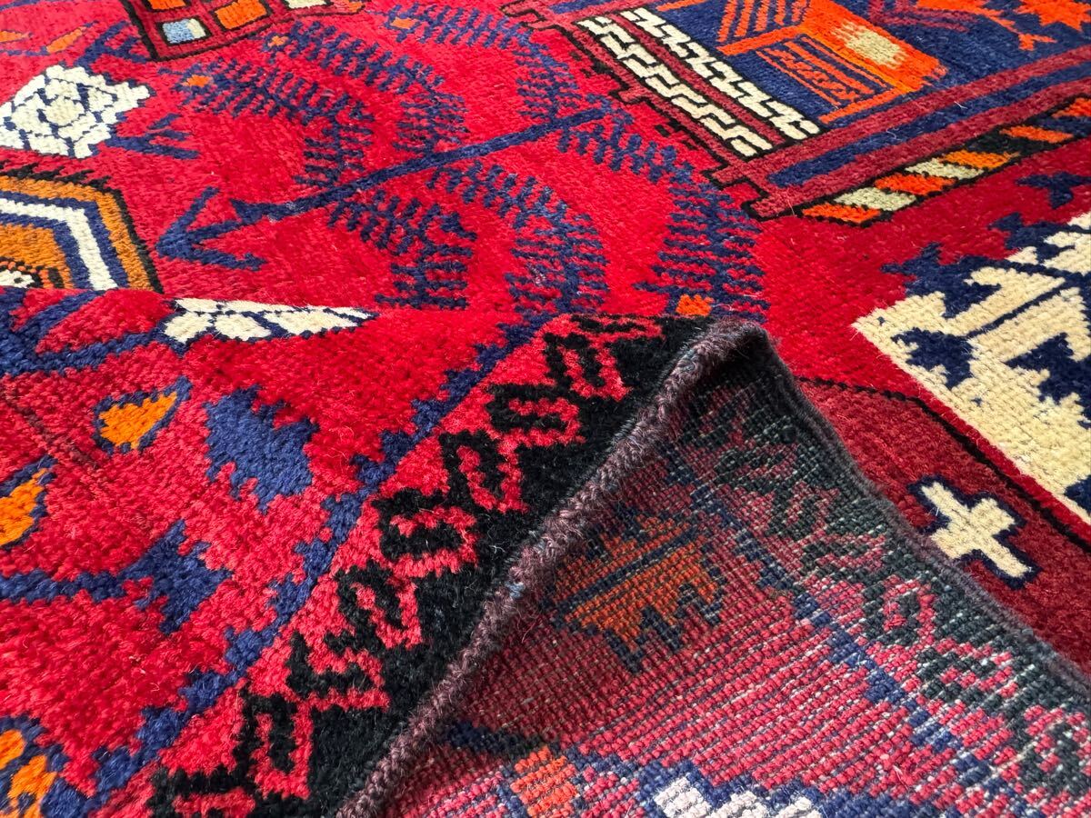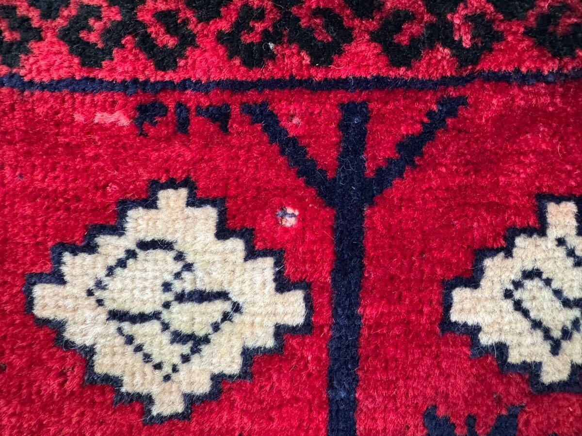 左上にほつれ、全体に擦れが見られますが、ヴィンテージラグの味としてお楽しみください。写真をご確認ください。