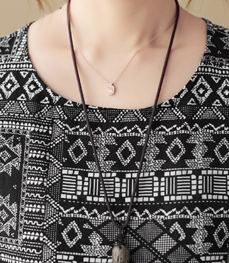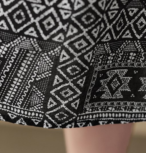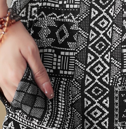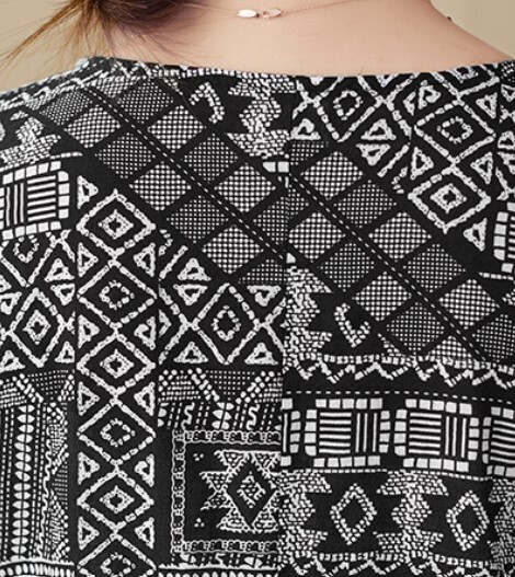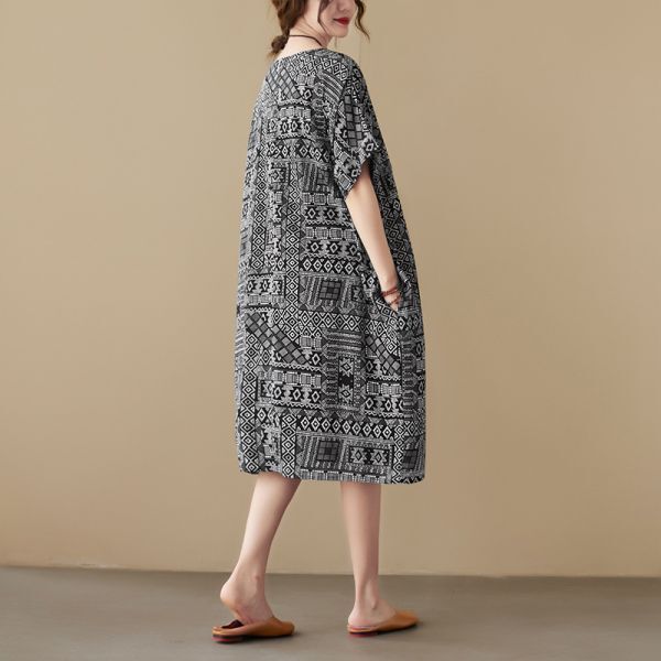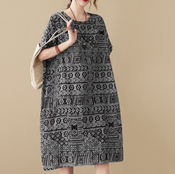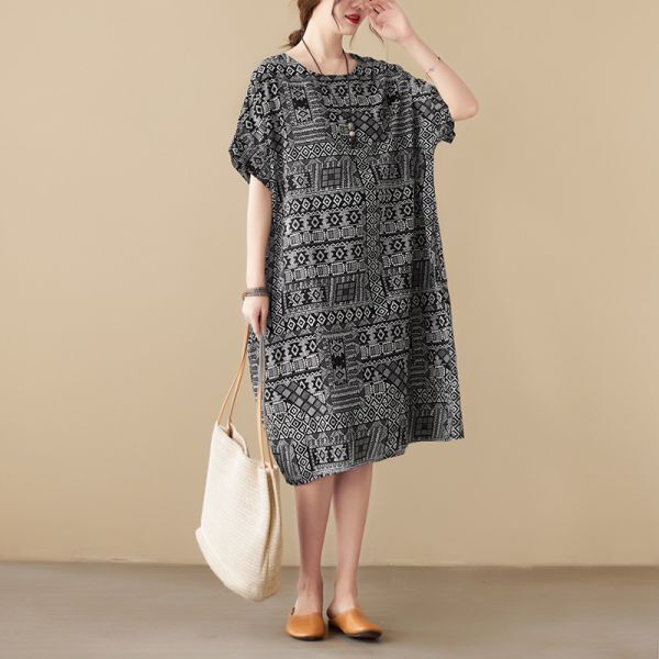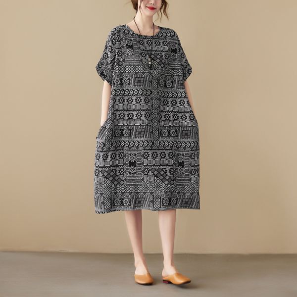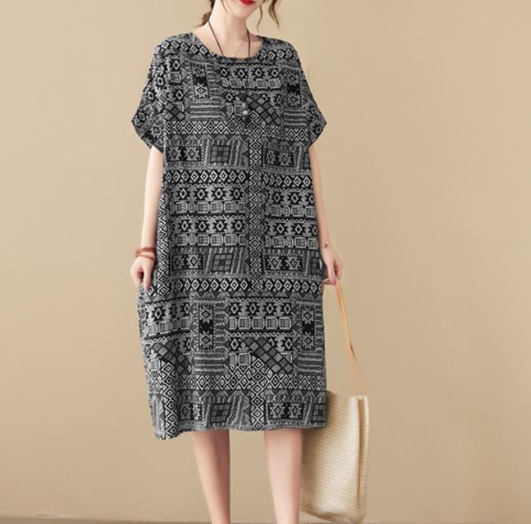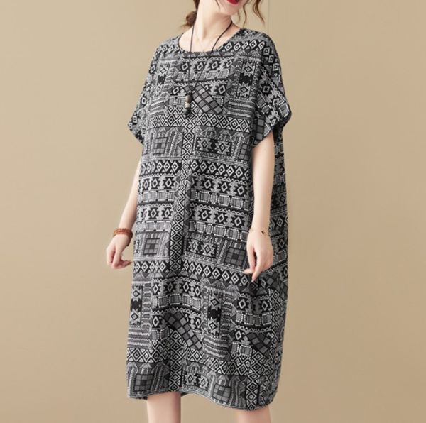 ★★★レディース ワンピース ラウンドネック ひざ丈 体型カバー プリント柄 EX37