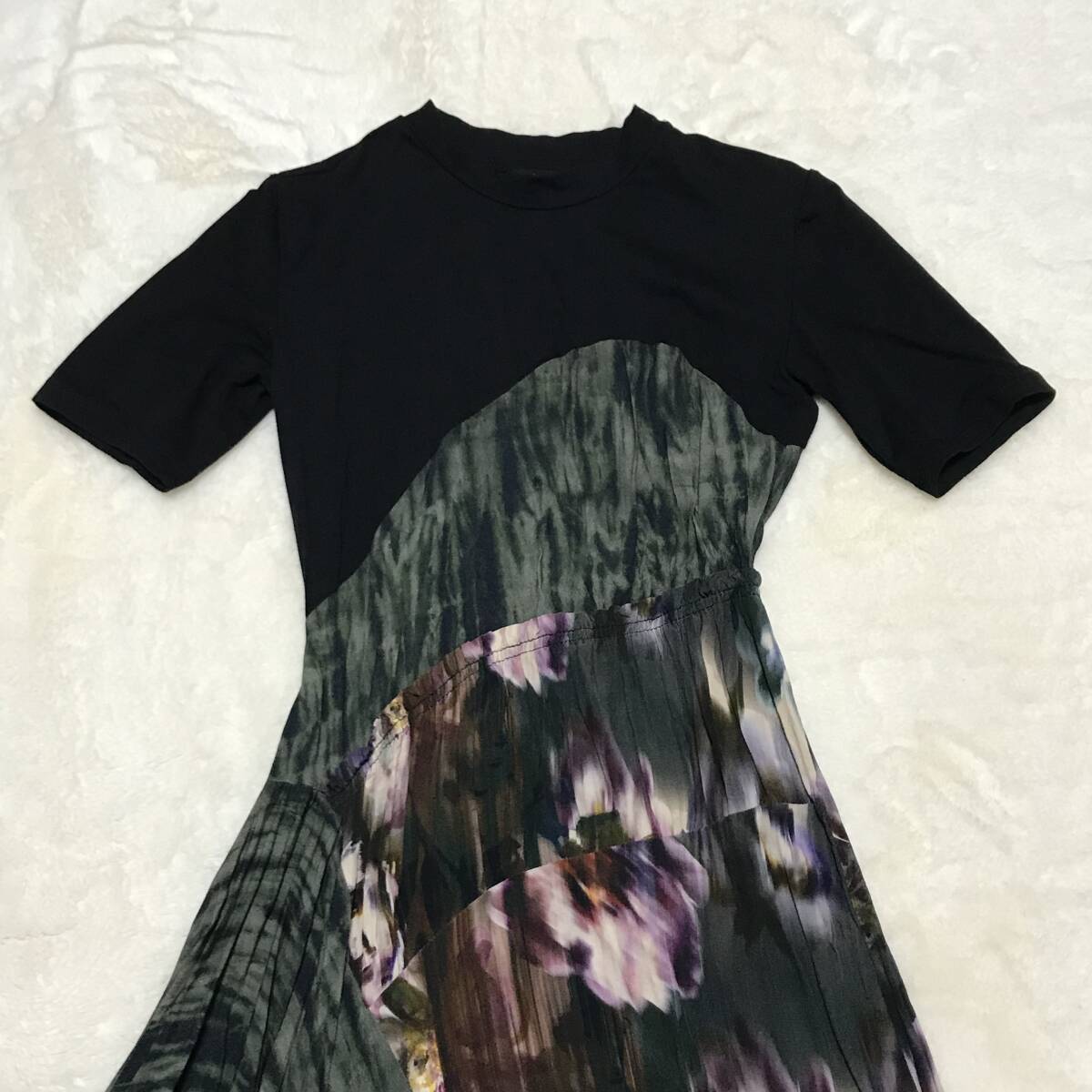 アシンメトリーや異素材ドッキングなど、デザインアイデアを1枚に取り入れたオリジナリティあふれるワンピースです。