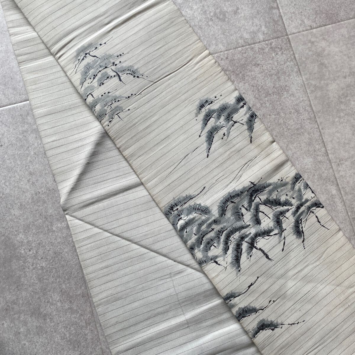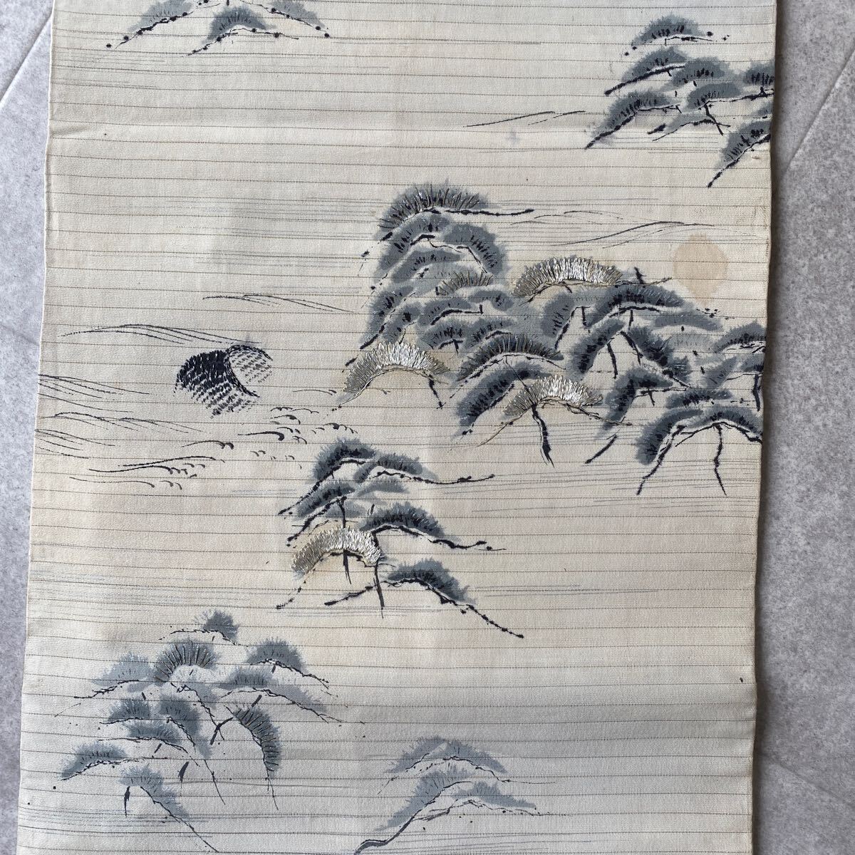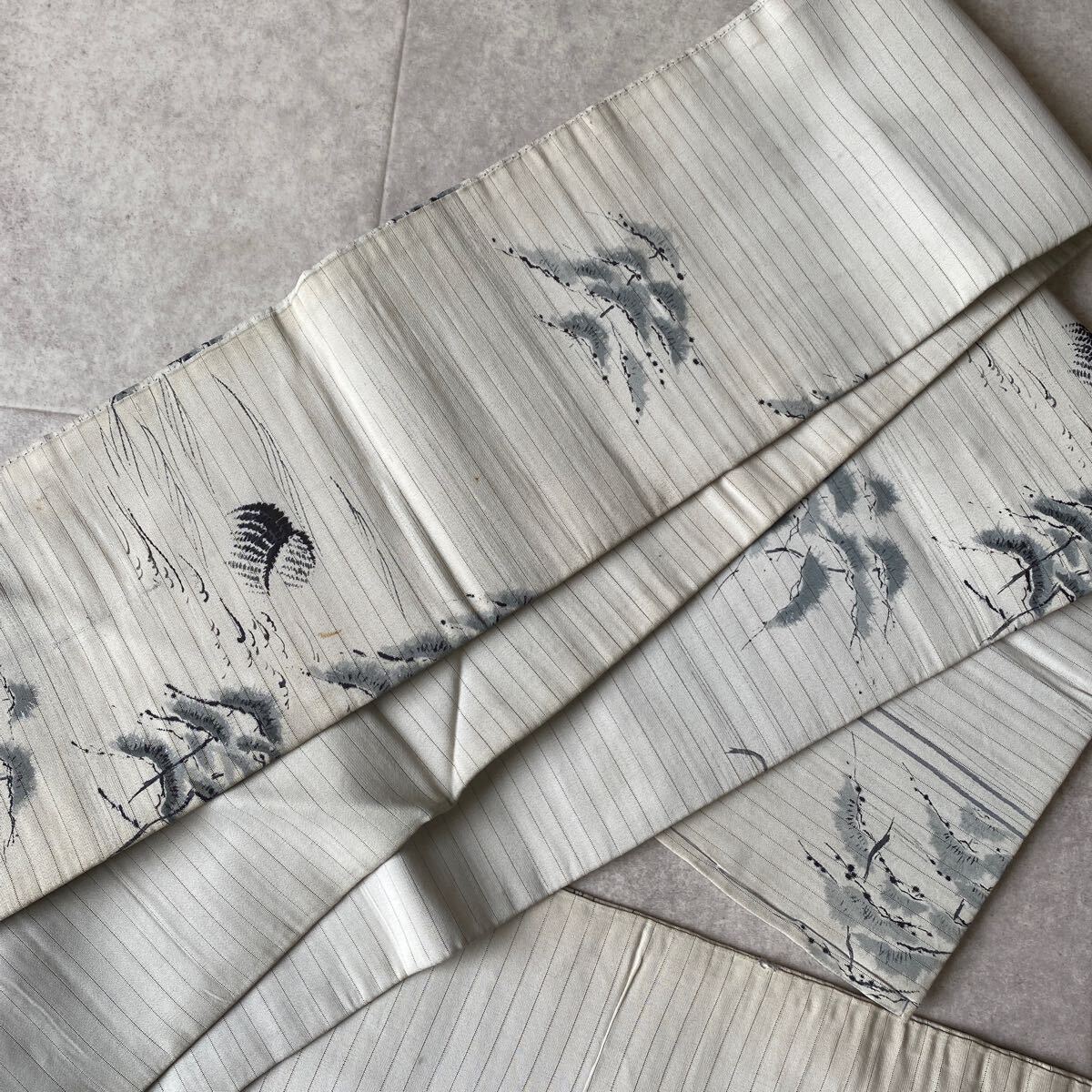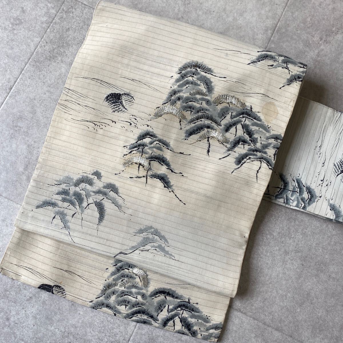 アンティーク 名古屋帯 絽 紗 夏帯 夏物 着物 昭和レトロ 大正ロマン モダン 和洋折衷コーデ リメイク 白地 松 水墨画 刺繍 銀糸 お21-12w