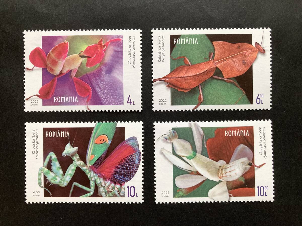 ルーマニア 2022年 発行  「アニマルファンタジー・カマキリ」 (ハナカマキリ、マルムネカレハカマキリ、コモンフラワーマンティス、ハナカマキリ) 4種完 未使用、NH(ヒンジ跡無)、糊付です。