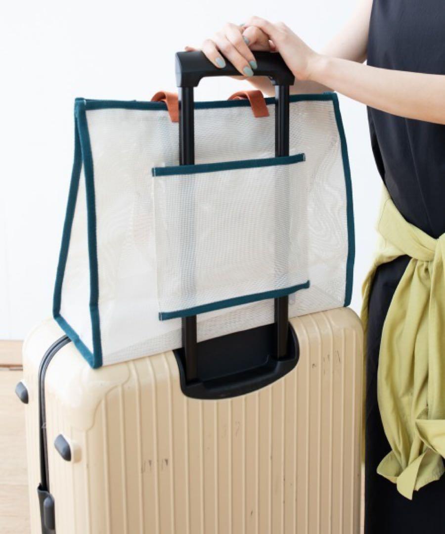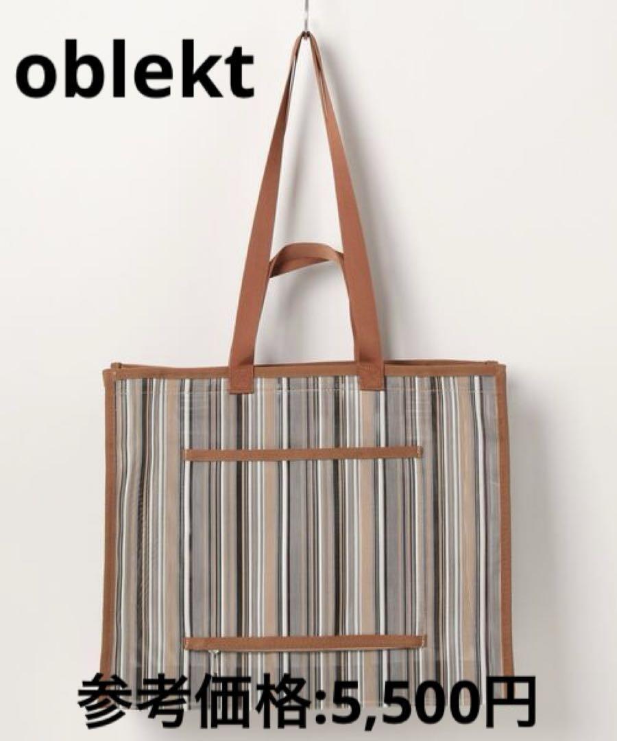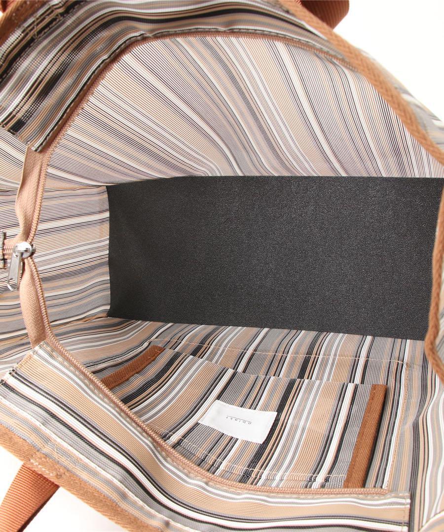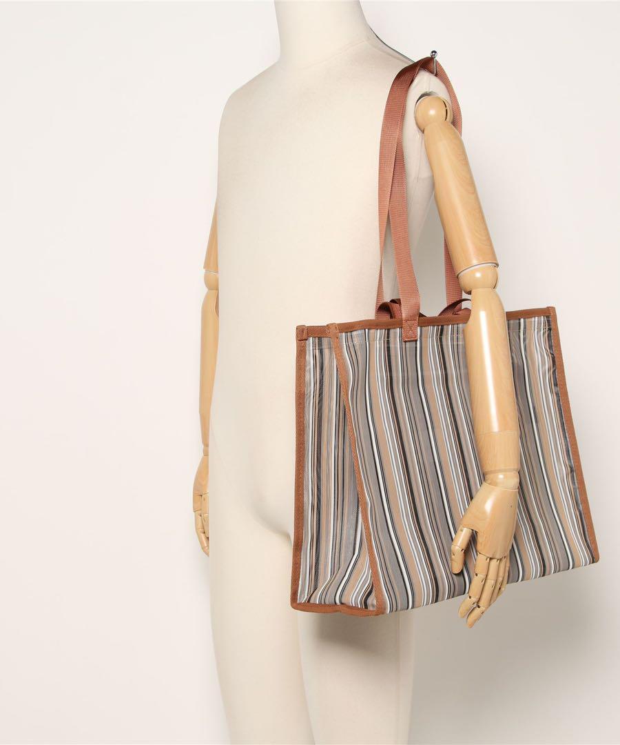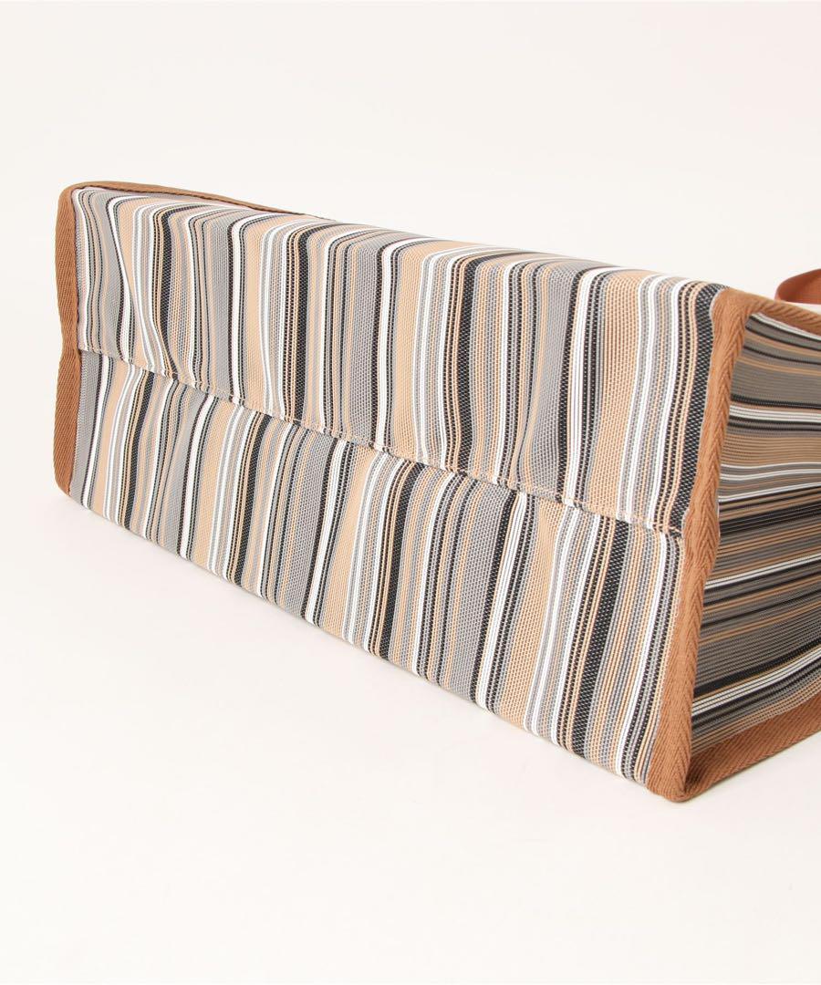 ストライプ柄の大きめショルダーバッグ、外ポケット付きで使い勝手良好。
