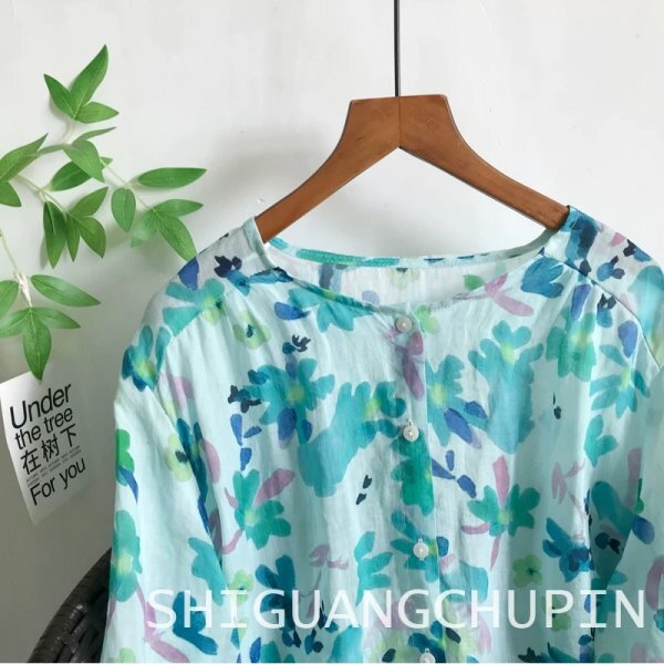 sg 0705 チュニック トップス ワイシャツ 半袖 ゆったり 麻100% フリーサイズ ナチュラル 通気性肌触り抜群 プリント花柄80