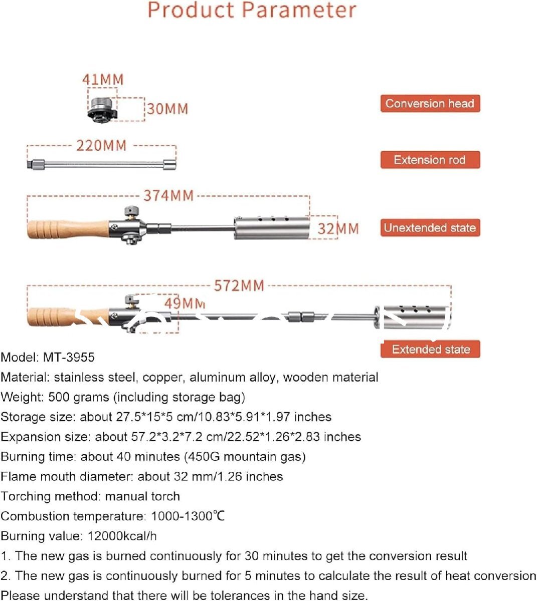 材質:アルミニウム合金、ステンレス鋼、木材;火口直径:32mm;燃焼温度:1000~1300℃;燃焼値:12000kcal/h;燃焼時間:40分(高山地帯の450g缶);変換ヘッド:41 * 30mm;ジョイントロッド:220mm;非伸長状態:374 x 49mm;伸長状態:572 x 49mm