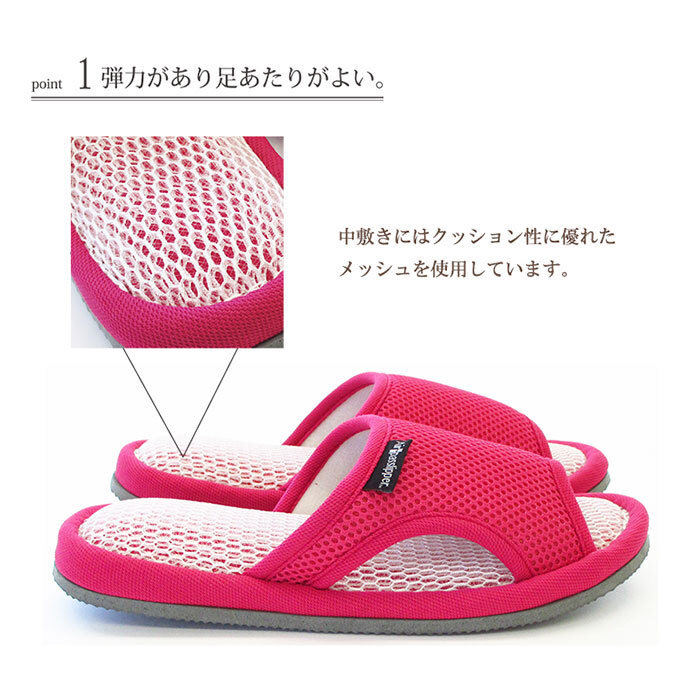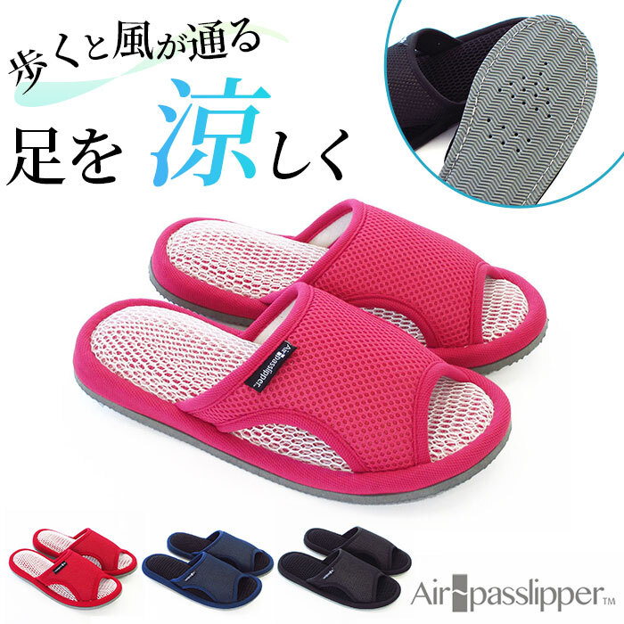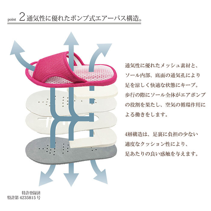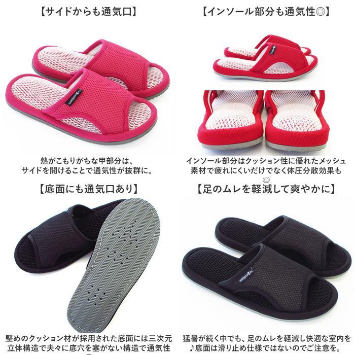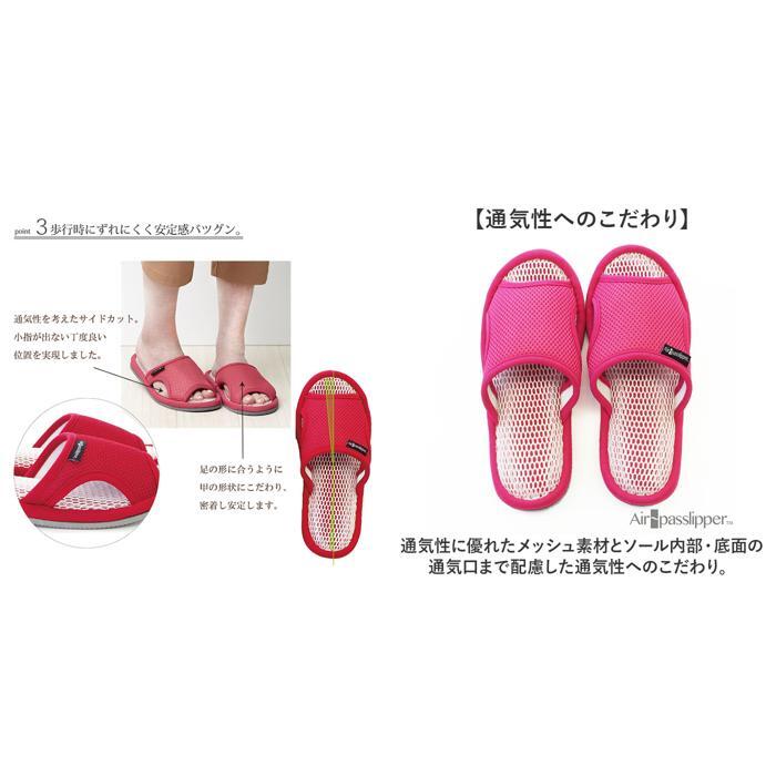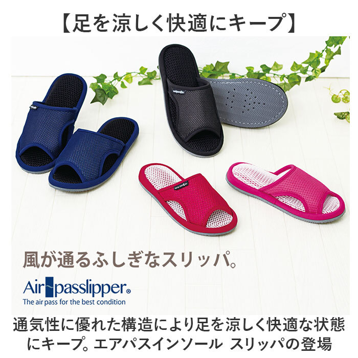 商品説明 | ・・【足を涼しく快適にキープ】 ・通気性に優れた構造により足を涼しく快適な状態にキープ。エアパスインソール スリッパの登場 ・【通気性へのこだわり】 ・通気性に優れたメッシュ素材とソール内部・底面の通気口まで配慮した通気性へのこだわり。 ・【サイドからも通気口】 ・熱がこもりがちな甲部分は、サイドを開けることで通気性が抜群に。 ・【インソール部分も通気性◎】 ・インソール部分はクッション性に優れたメッシュ素材で疲れにくいだけでなく体圧分散効果も ・【底面にも通気口あり】 ・堅めのクッション材が採用された底面には三次元立体構造で夫々に底穴を塞がない構造で通気性◎ ・【足のムレを軽減して爽やかに】 ・猛暑が続く中でも、足のムレを軽減し快適な室内を♪底面は滑り止め仕様ではないのでご注意を。 |