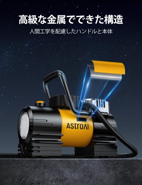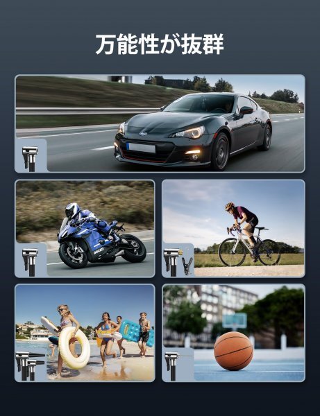 車のタイヤの空気圧管理は、安全運転や燃費向上につながります。AstroAI車の空気入れは、わずか1分でタイヤに空気を注入できるため、忙しい方にもぴったり。コンパクトなデザインと軽量設計で、車内でも場所を取らず、いつでも簡単に使用できます。自動車だけでなく、自転車やバイク、ボールなどにも対応しているため、様々なシーンで活躍します。