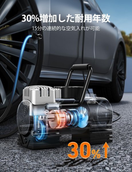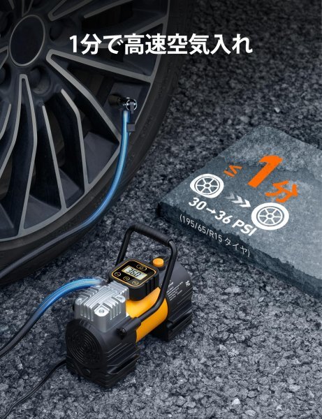 - 空気注入時間:195/65/R15型タイヤを30 PSIから36 PSIに1分で注入