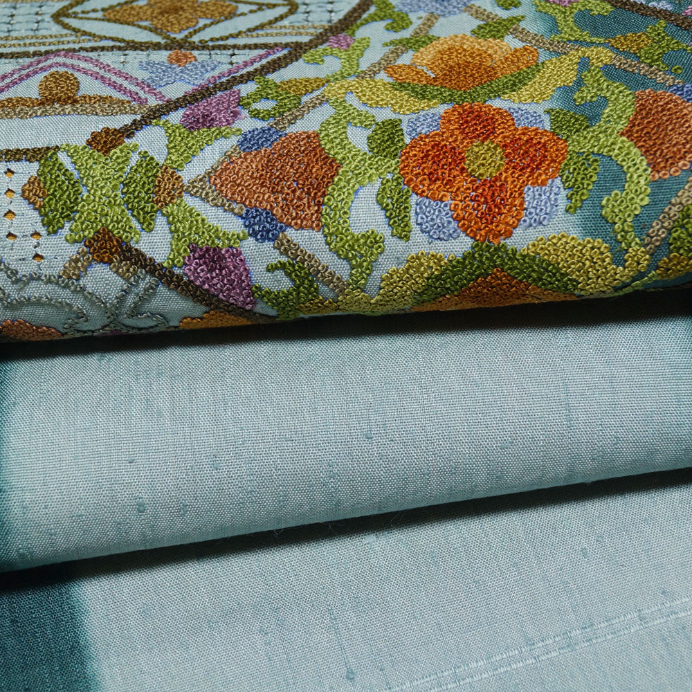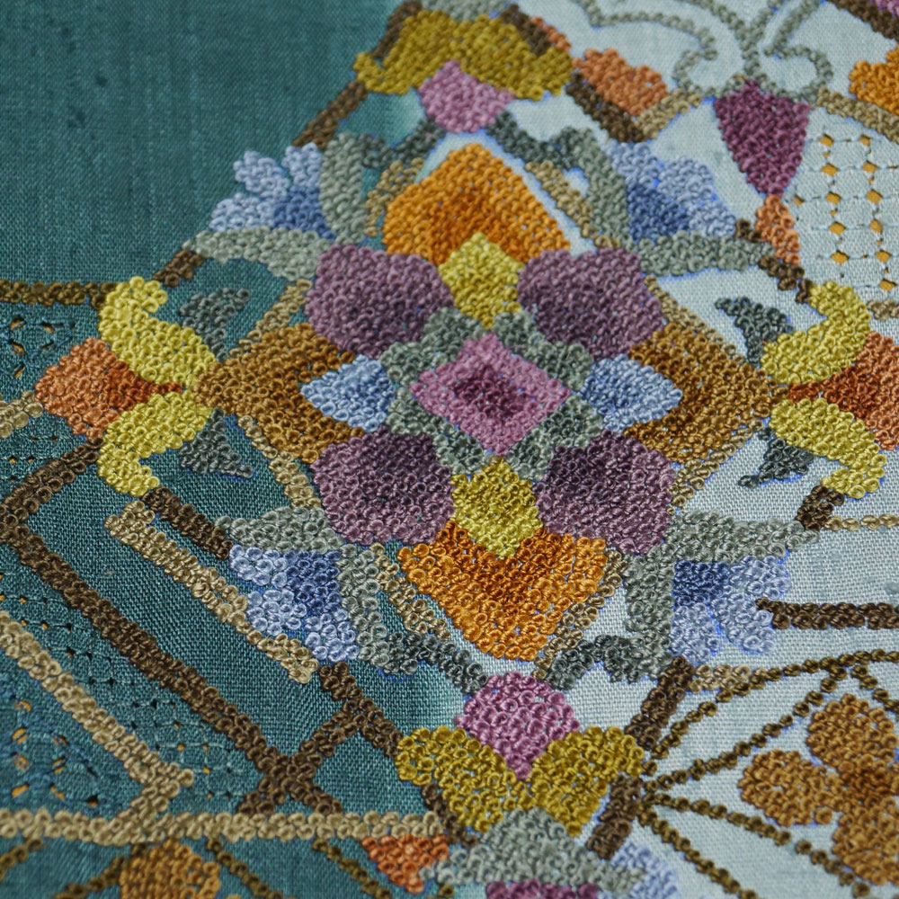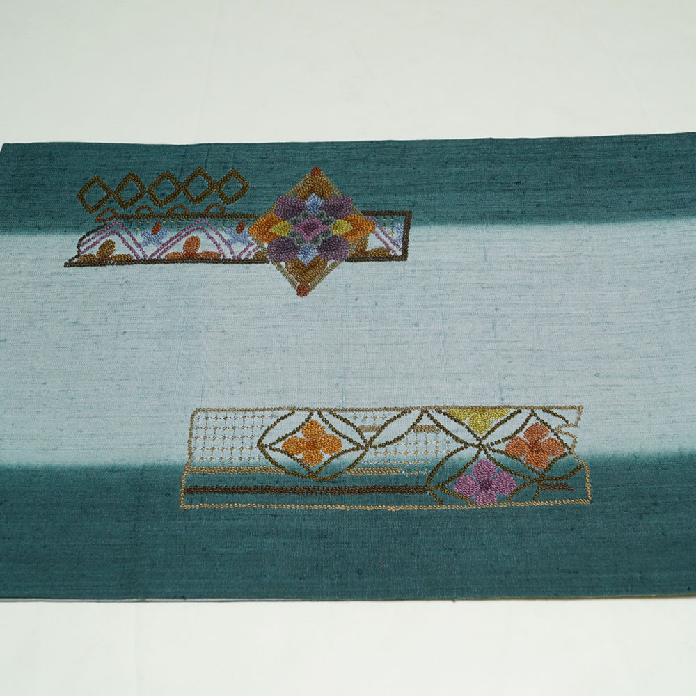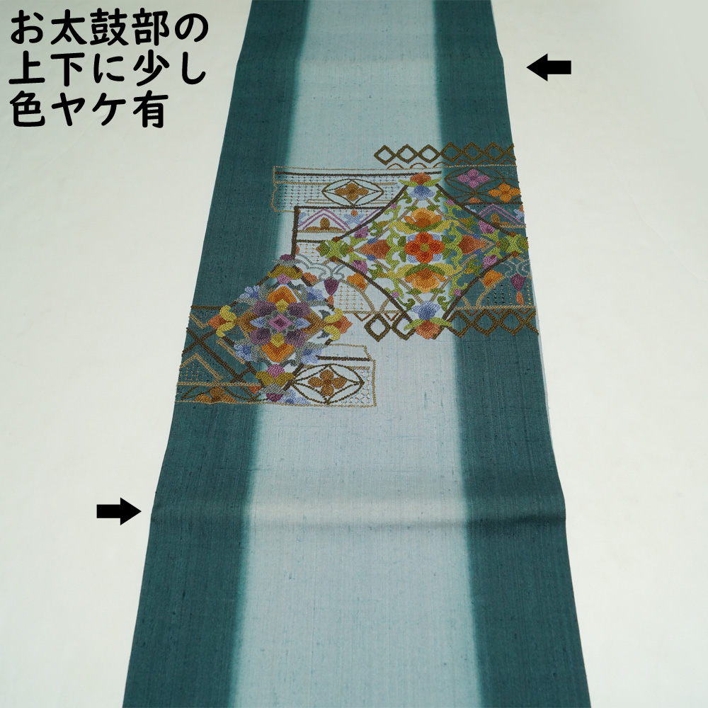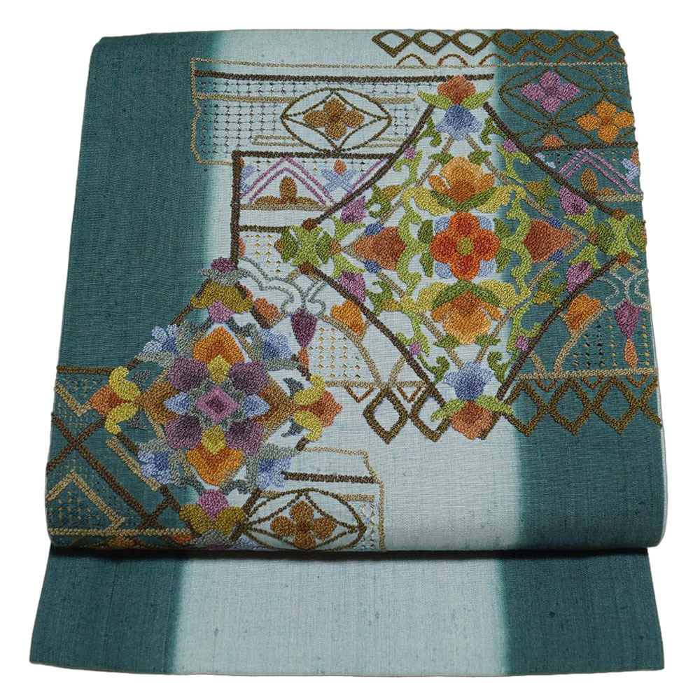 | 商品 説明 | 薄いアクアグリーン・ターコイズグリーン色系に染め分けされた真綿紬地に菱華文、更紗などの模様が相良刺繍・スワトウ刺繍にて施された洒落袋帯です。 |