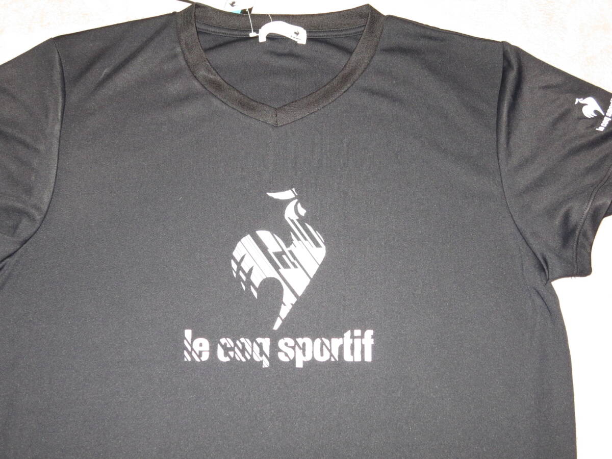 未使用タグ付きのルコックの速乾Tシャツです。サイズはレディースO(LL)、ポリエステル100%です。Vネックで、色は黒です。胸と左袖に白でプリントが入っています。シミ、汚れなどありません。
