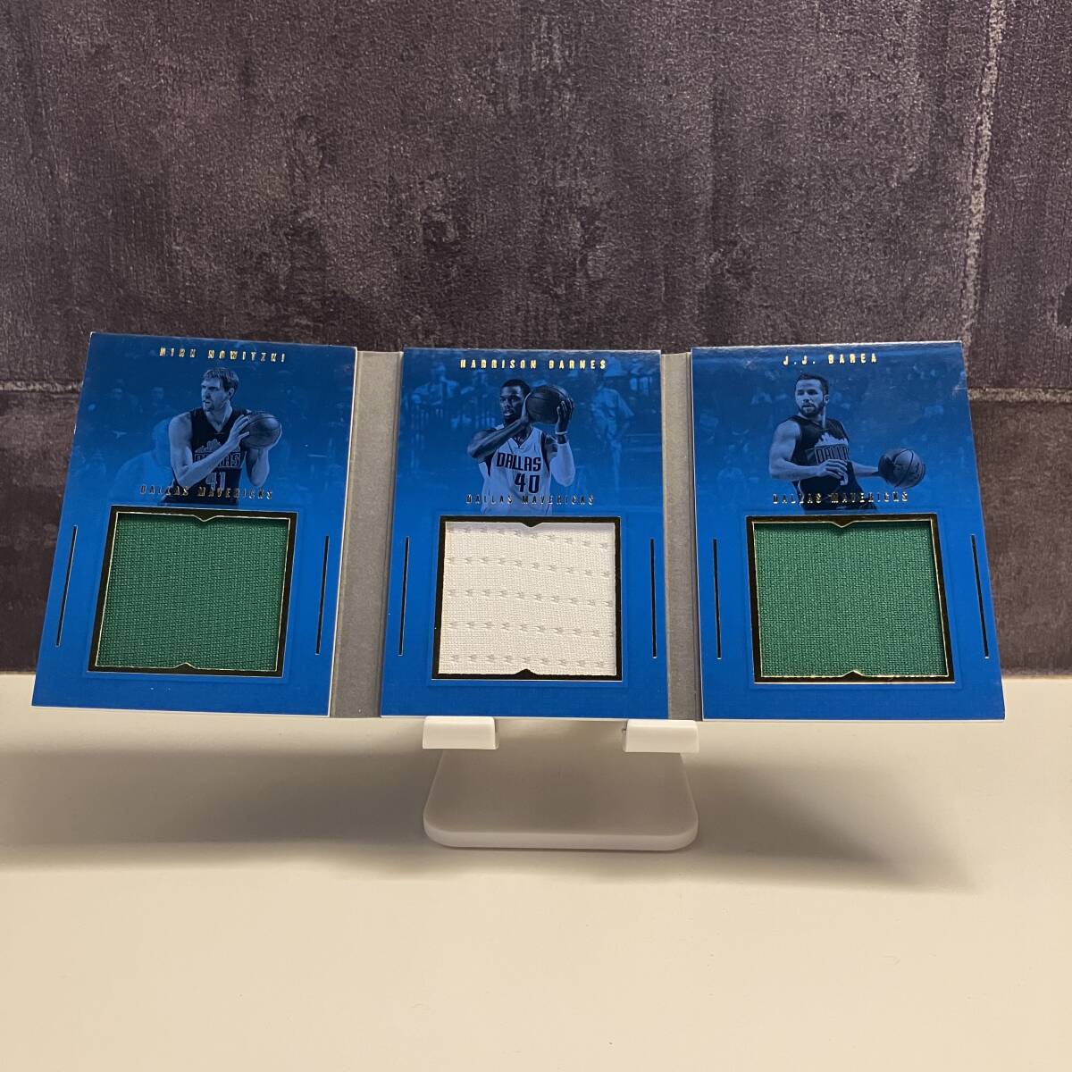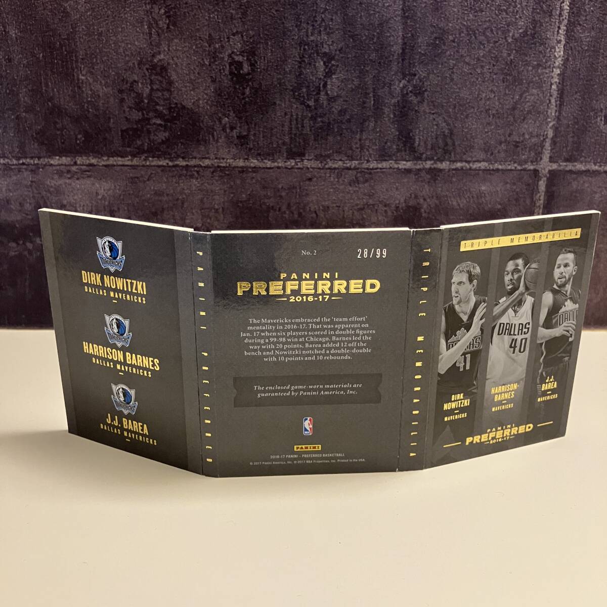 2017 Panini Dirk Nowitzki, Harrison Barnes, J.J. Barea 28/99 ダラスマーベリックス ブックトリプルジャージカード