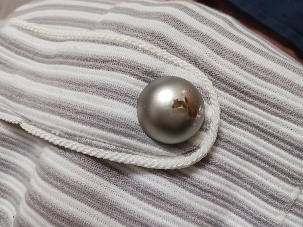 後ろ身頃にあるボタンの片方が画像のように艶消し加工がはがれています事をご了承下さい。。