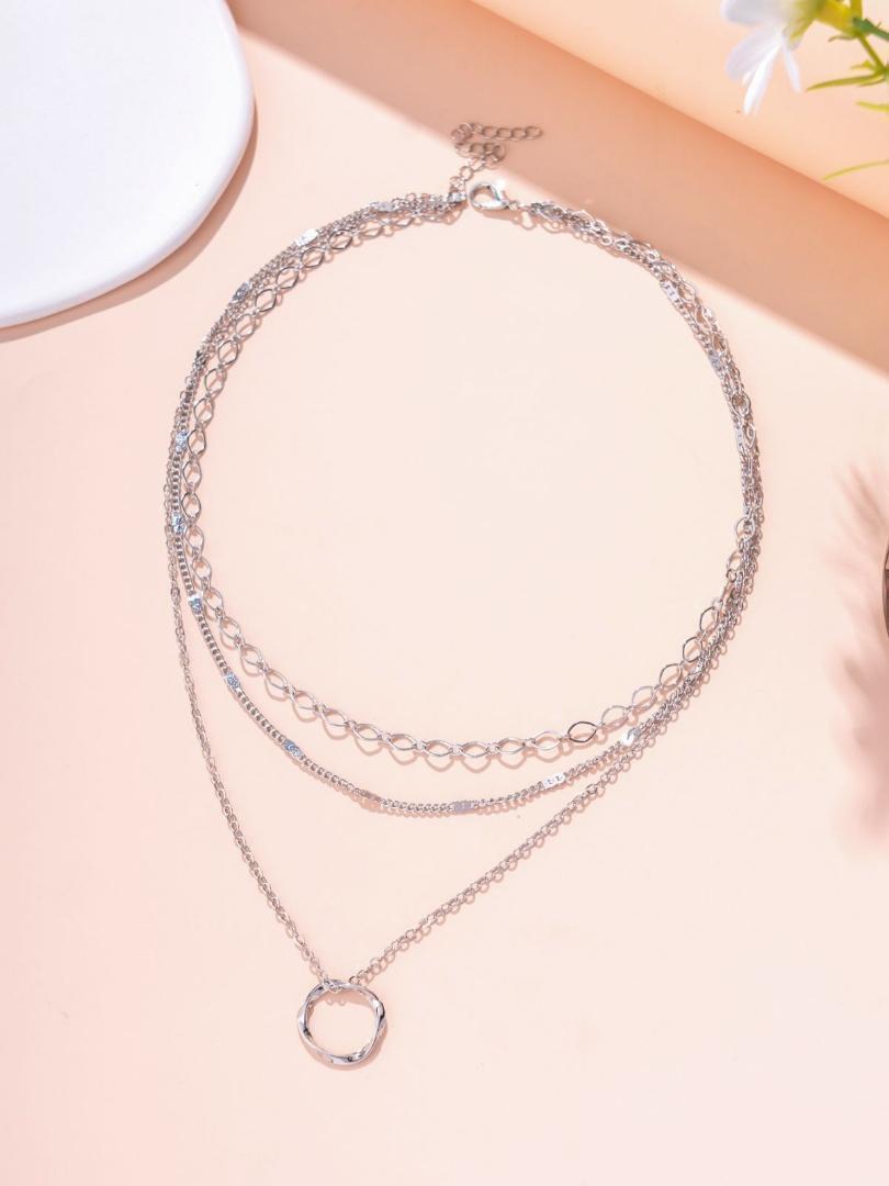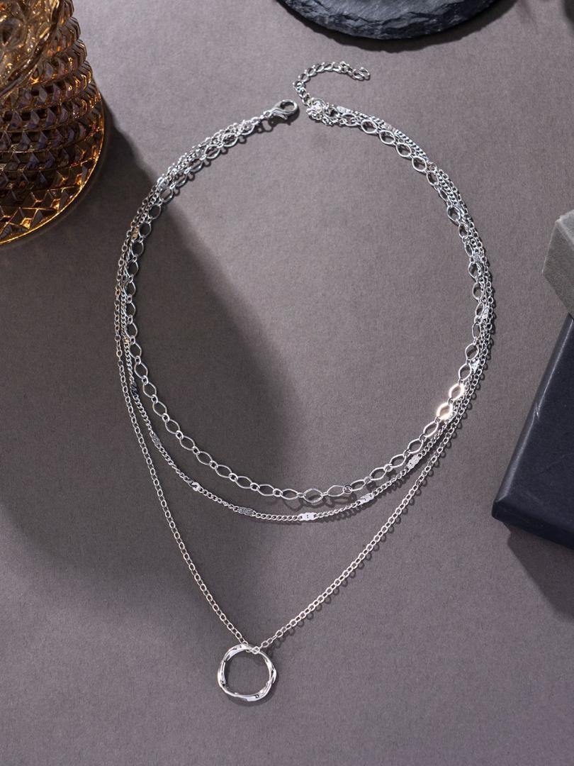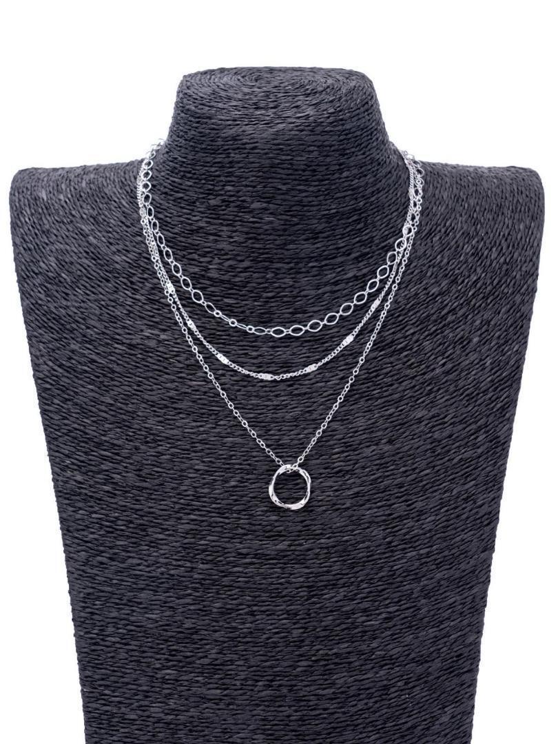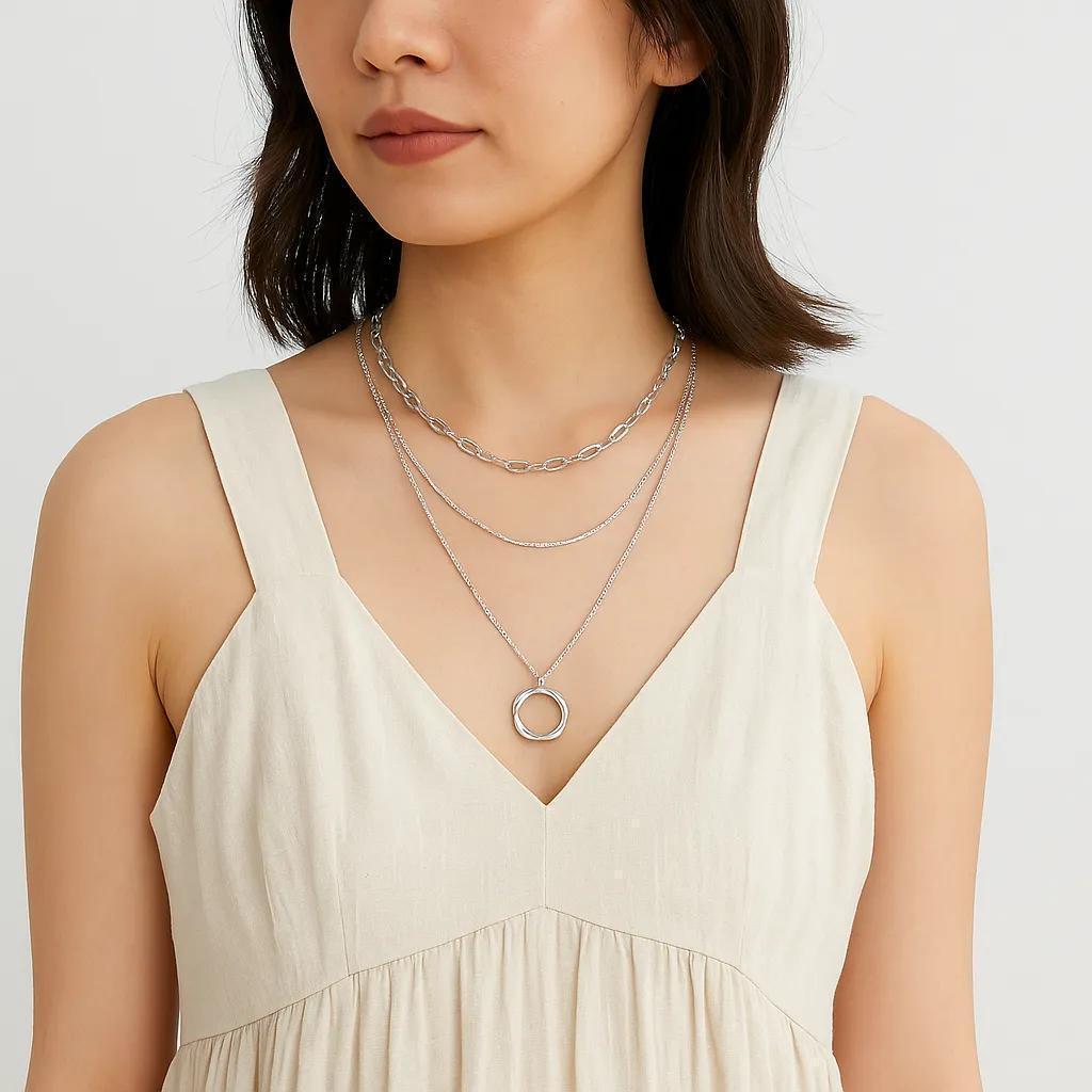 シンプルで洗練された印象を与える、シルバーカラーのレイヤードネックレスセット。