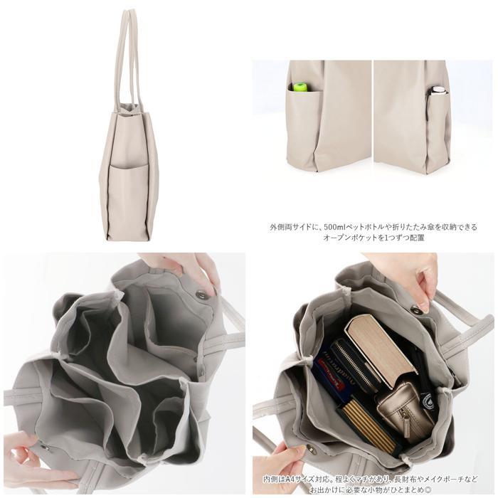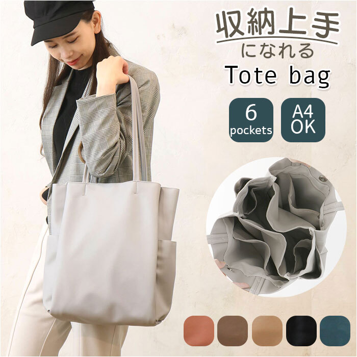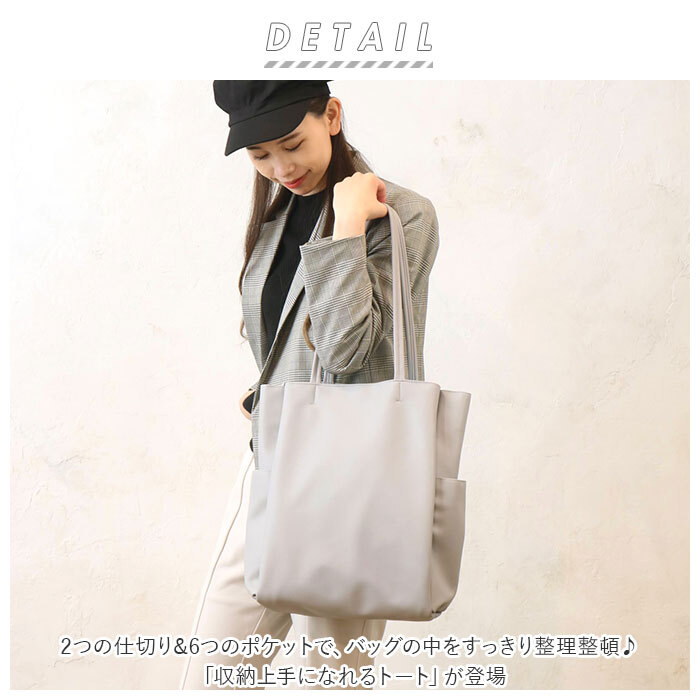 商品説明 | ・・・2つの仕切り&6つのポケットで、バッグの中をすっきり整理整頓♪「収納上手になれるトート」が登場。 ・バッグの中で小物が迷子になりにくい機能的な仕切り設計!荷物の定位置を決めることで、誰でも収納上手に♪ ・開口部はマグネットボタンで簡単開閉。 ・内側はA4サイズ対応。程よくマチがあり、長財布やメイクポーチなどお出かけに必要な小物がひとまとめ◎ ・前面・背面に仕切りポケットを設け、ノートやファイルなどが折り曲がることなく持ち運び可能。 ・小物収納に便利なファスナーポケット×1やオープンポケット×1、スリムボトルがすっぽり収まる縦長オープンポケット×2を装備。 ・パスケースや鍵を取り付けできるDカン付き。 ・外側両サイドに、500mlペットボトルや折りたたみ傘を収納できるオープンポケットを1つずつ配置。 ・柔らかく滑らかな手触りのフェイクレザー素材を使用。肩に掛けても手持ちでも馴染みやすく、オンオフ問わず活躍! ・シンプルなデザインで、ジェンダーレスにコーディネートできるアイテム。 |