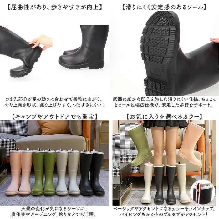 商品説明 | ・・【雨の日もおしゃれにお出かけ】 ・雨があがっても履きたくなる♪シンプルで可愛い「レディース用レインブーツ」が新登場。 ・【濡れても乾きやすくお手入れ簡単】 ・本体は水に強い素材。乾きが速く、お手入れも拭き取るだけ。 ・【いつでもどこでも足入れスムーズ】 ・ベルトなどがなく、スッと足入れOK。脱ぎ履きの手間を抑えてラクチン。 ・【しっかりカバーできるロング丈】 ・膝下あたりまですっぽり覆えるロングブーツ。雨の強い日や、ぬかるんだ路面でも安心。 ・【足元すらりキレイ魅せ♪】 ・ショートパンツやミニスカートとの相性抜群◎足がキレイに見えるシルエット。 ・【屈曲性があり、歩きやすさが向上】 ・つま先部分が足の動きに合わせて柔軟に曲がり、やや上向き形状。蹴り上げやすく、つまずきにくい! ・【滑りにくく安定感のあるソール】 ・底面に細かな凹凸を施した滑りにくい仕様。ちょこっとヒールは幅広仕様で、安定した歩行をサポート。 ・【キャンプやアウトドアでも重宝】 ・天候の変化が気になるシーンに!農作業やガーデニング、釣りなどでも活躍。 ・【お気に入りを選べるカラー】 ・ベーシックやアクセントになるカラーをラインナップ。パイピング&かかとのプルタブがアクセント! |