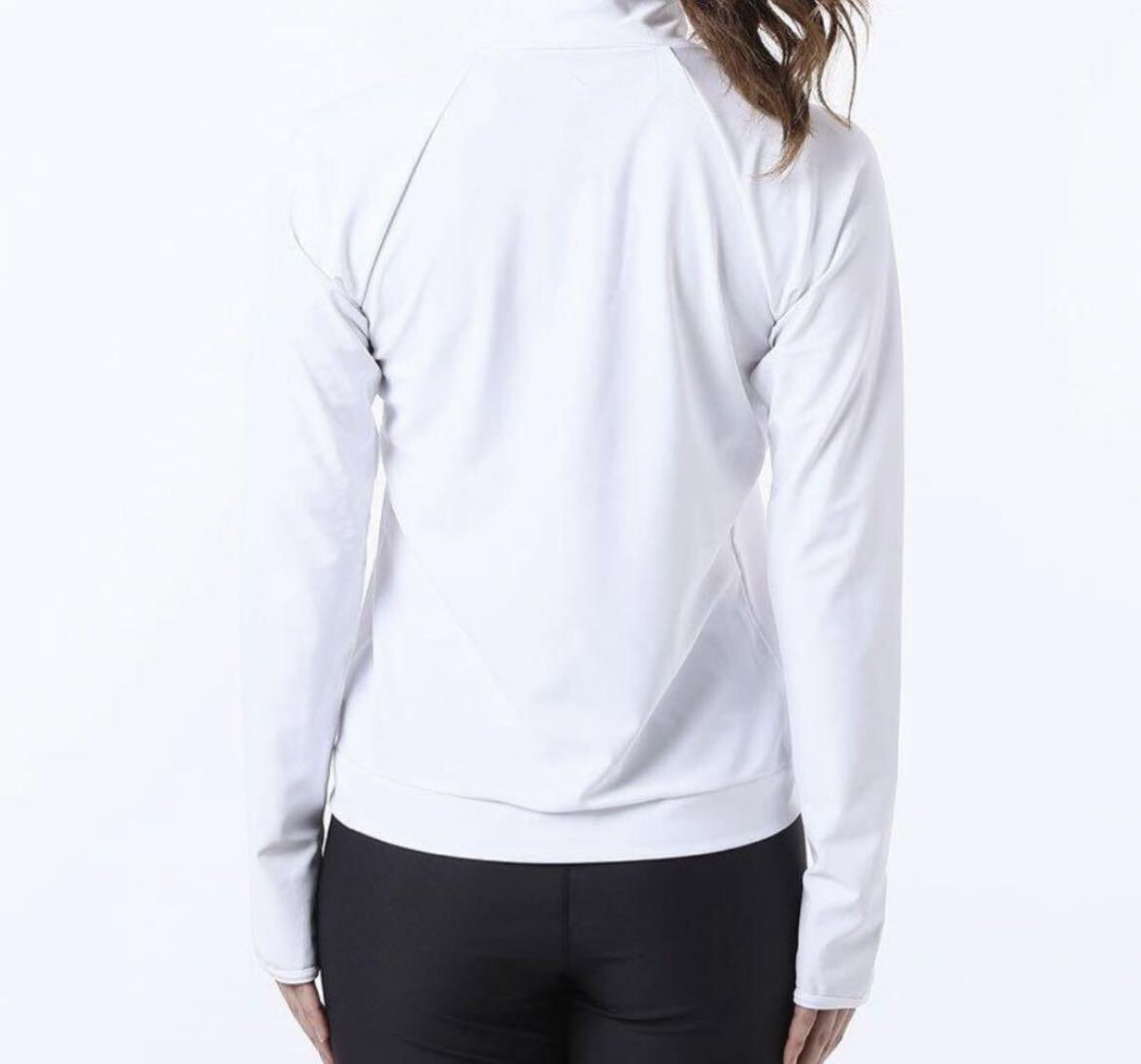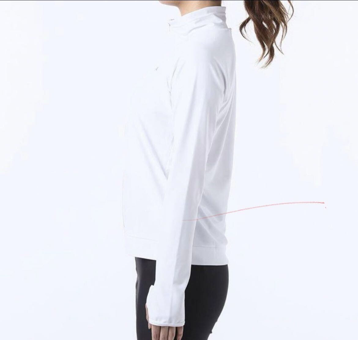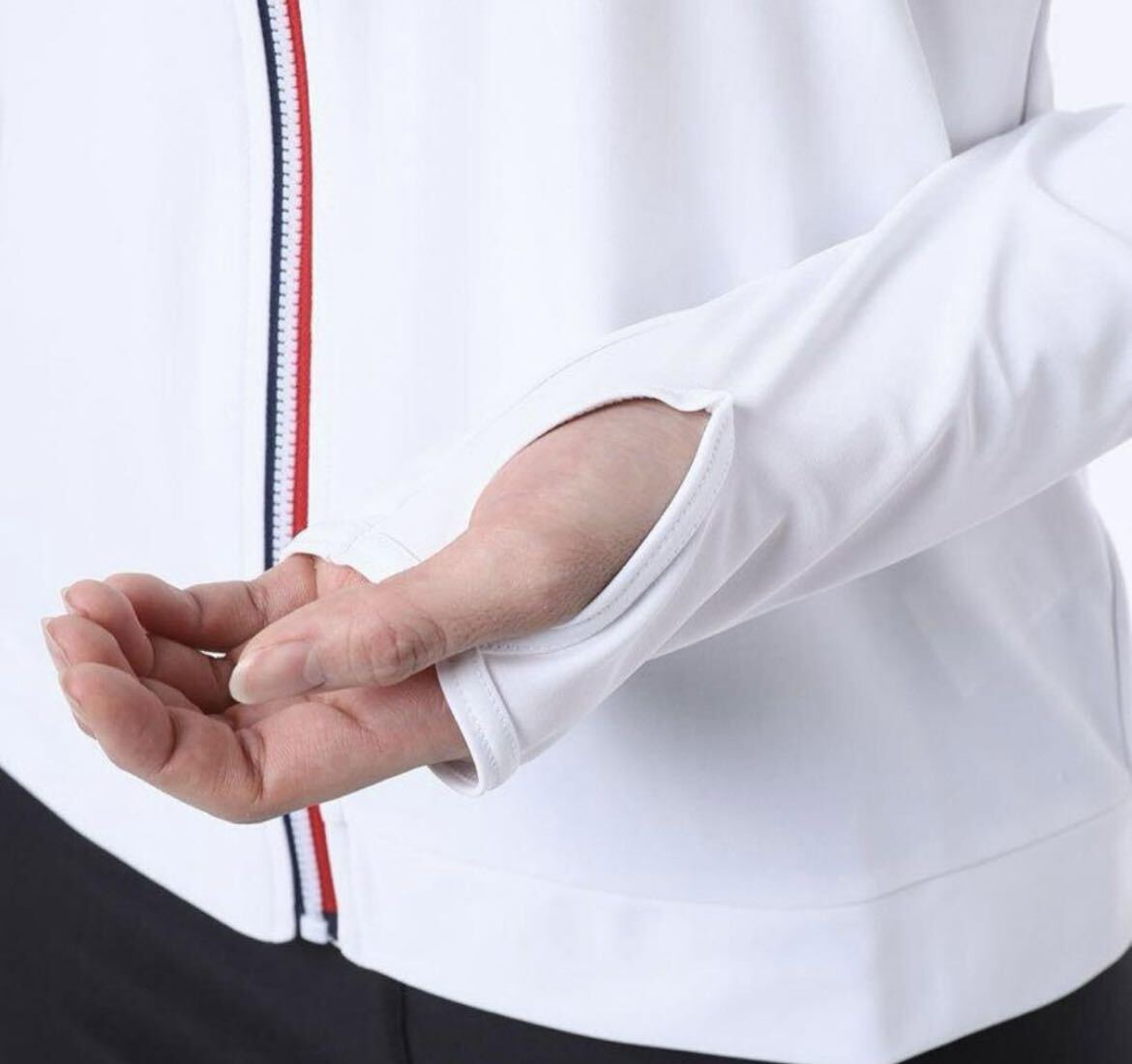 2way方向に良く伸びる速乾素材のフルジップジャケット。袖口指穴付。