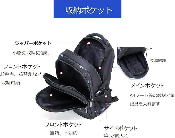 【機能性抜群】 リュックにはメインポケット1つ、パソコン、本を置けますし、3つのフロントポケットがスマホや財布など、すぐに取り出したい小物をしっかり収納して、サイドポケット2つ、ボトル、傘収納可能です【安全性と耐久性】無臭で、環境にやさしい素材、さらに頑丈でなめらかなジッパー付きで、摩擦性に強く、耐久性に優れて、使っていただいています。
