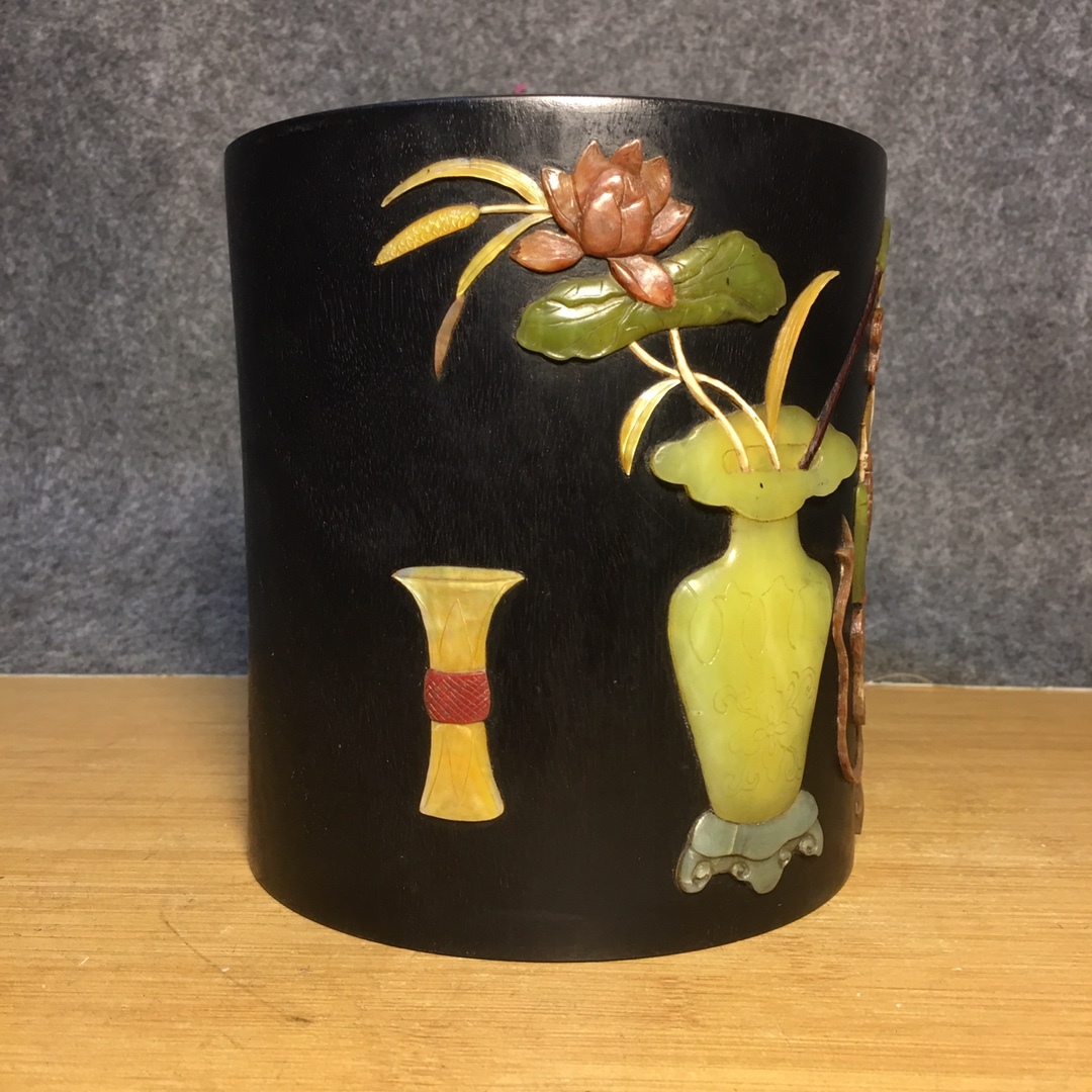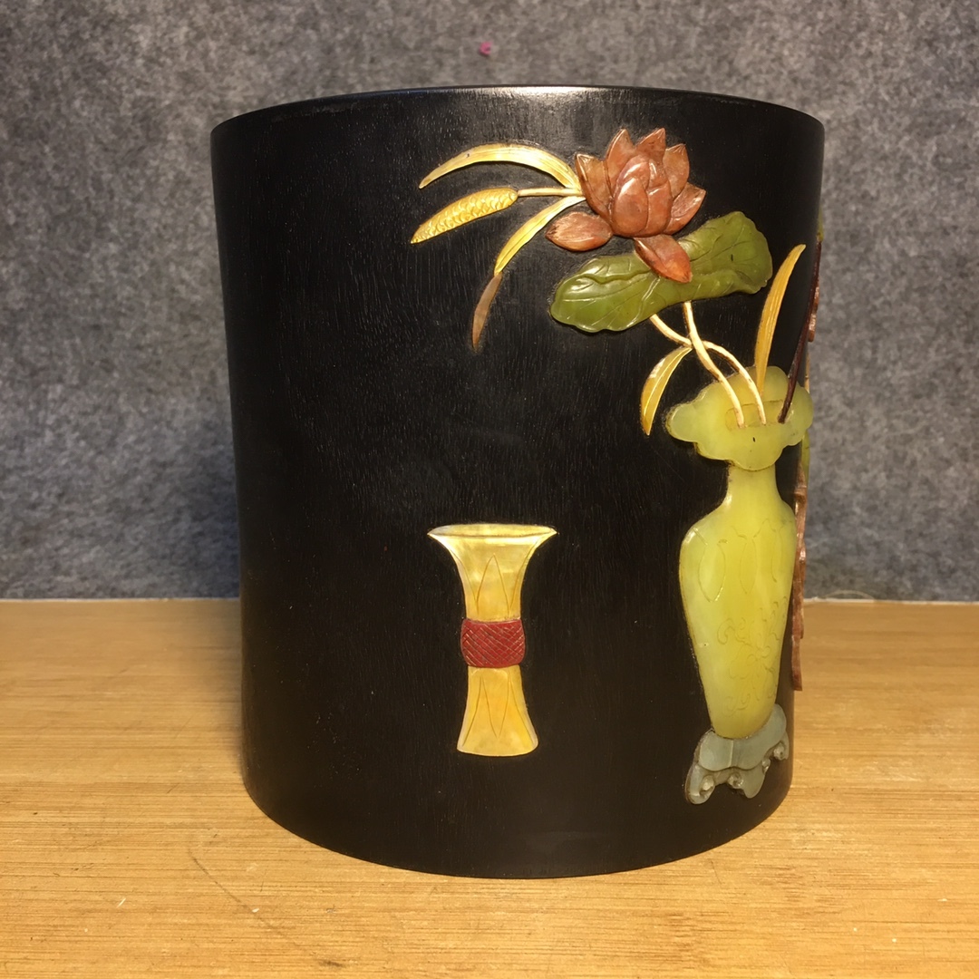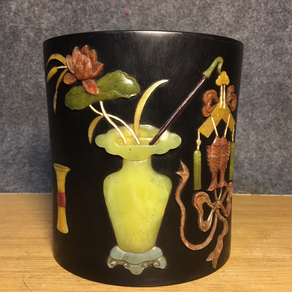*珍品旧蔵* 清 紫檀 百宝 モザイク筆立て 筆道具 文房具 置物 極細工 唐物 中国古玩 骨董品 古美味 H45