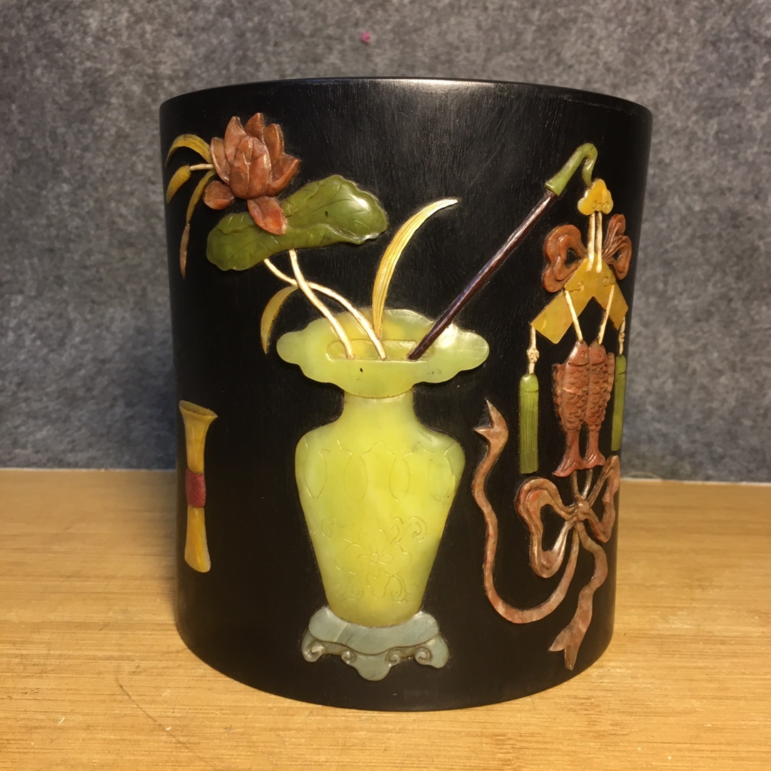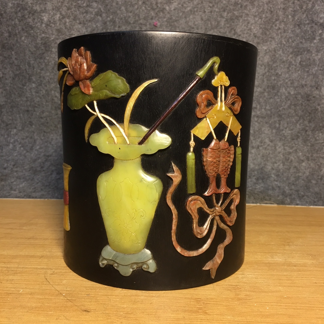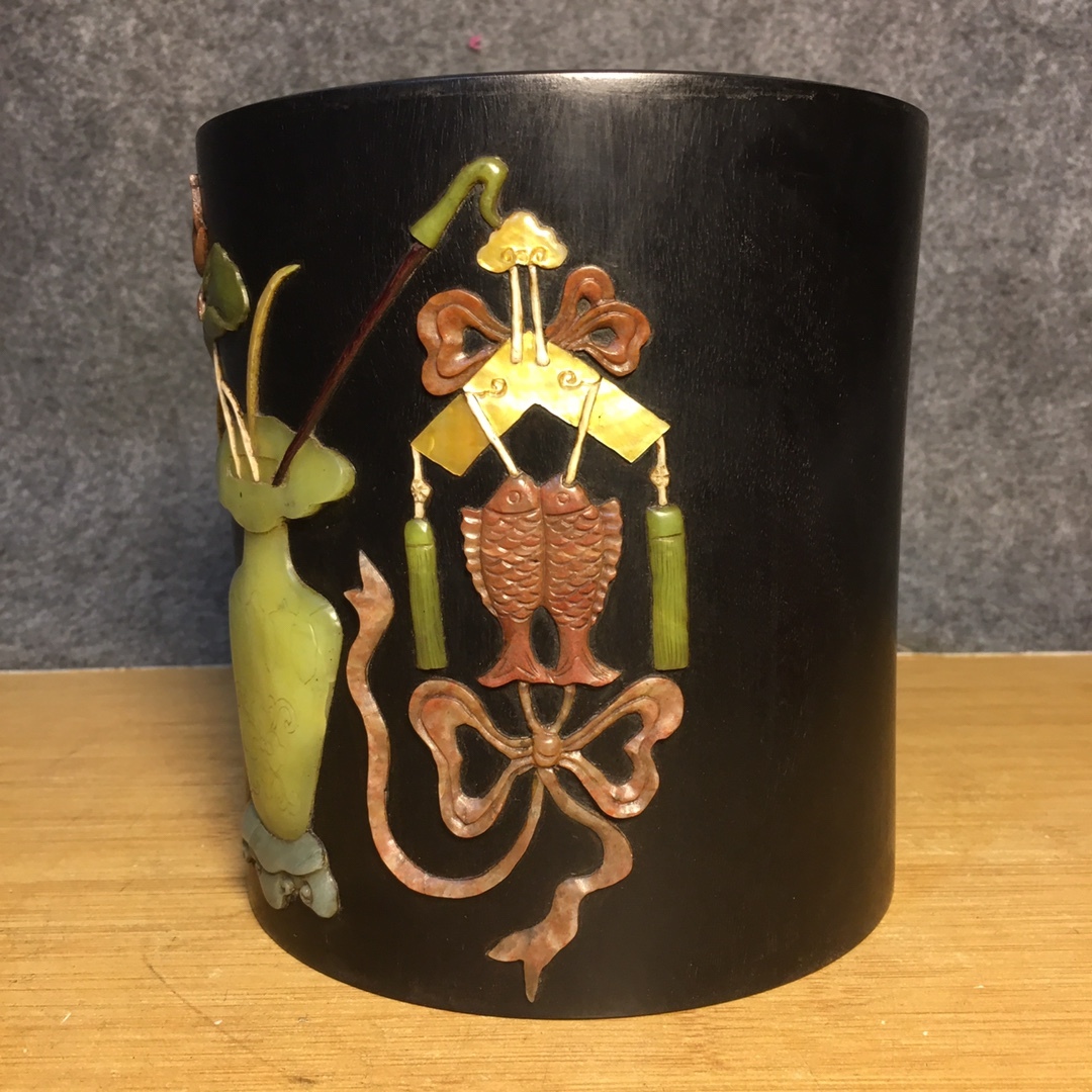 *珍品旧蔵* 清 紫檀 百宝 モザイク筆立て 筆道具 文房具 置物 極細工 唐物 中国古玩 骨董品 古美味 H45
