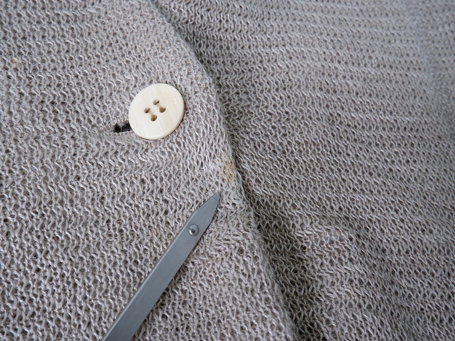 B:やや傷や汚れあり (特記事項: 第一ボタン下にシミ、リネンニット特有の細かなツレが多少ございます。)