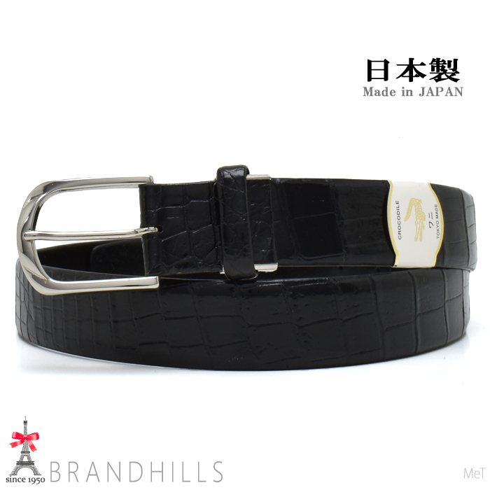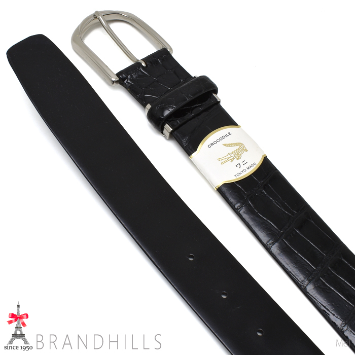 クロコダイル ベルト メンズ ブラック シャイニング加工 紳士用 黒 幅35ミリ ピンバックル式 裏:牛革 日本製 新品