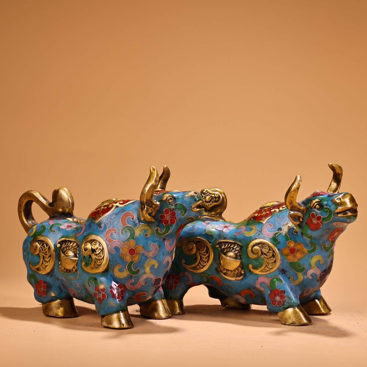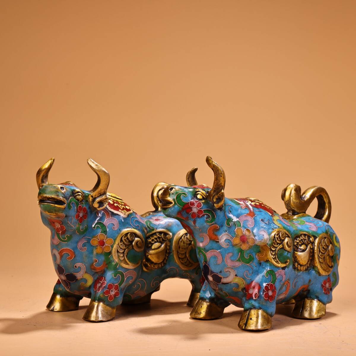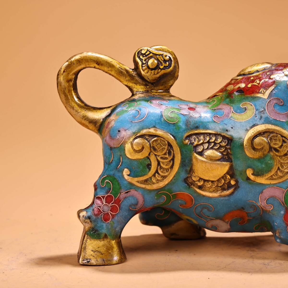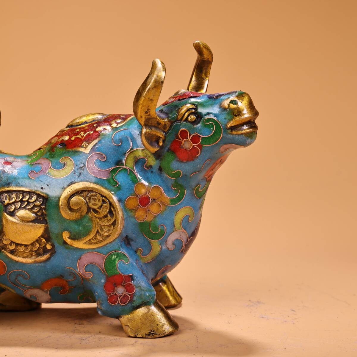 蔵友館蔵品 純銅彫 景泰藍琺瑯彩招財牛 文案置物 極細工 古賞物 古美味 中国唐物 東洋彫刻 時代物 骨董 中国古美術