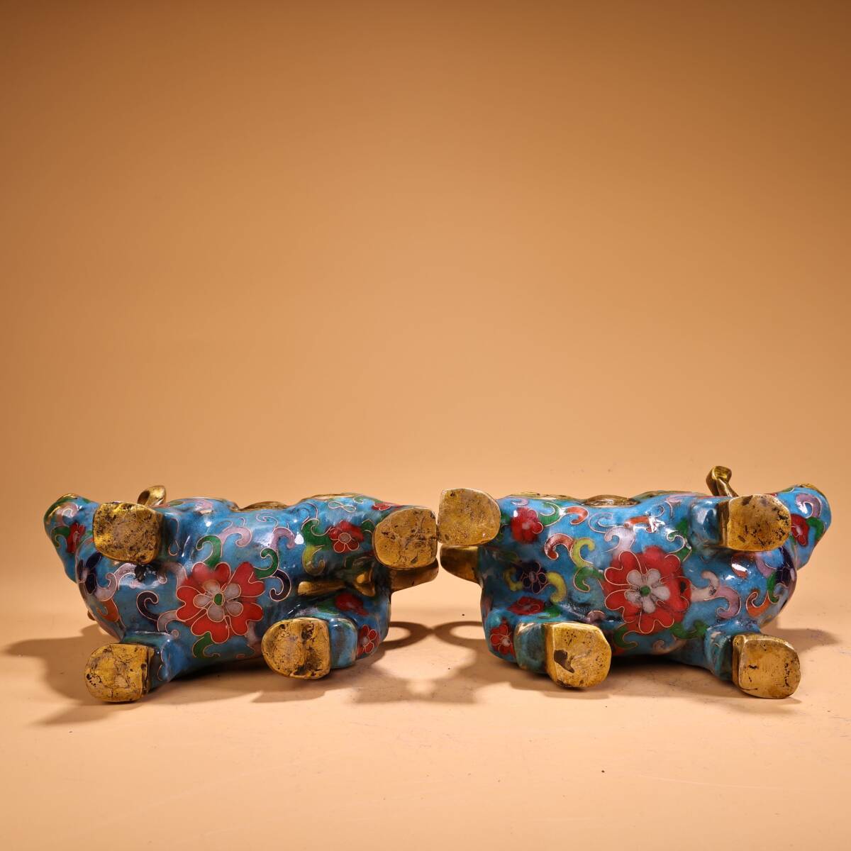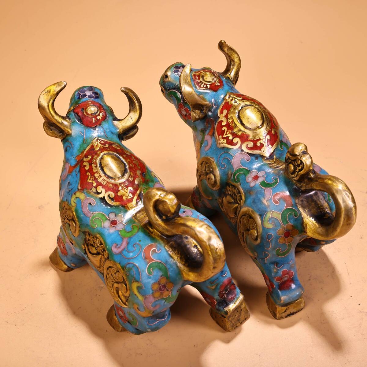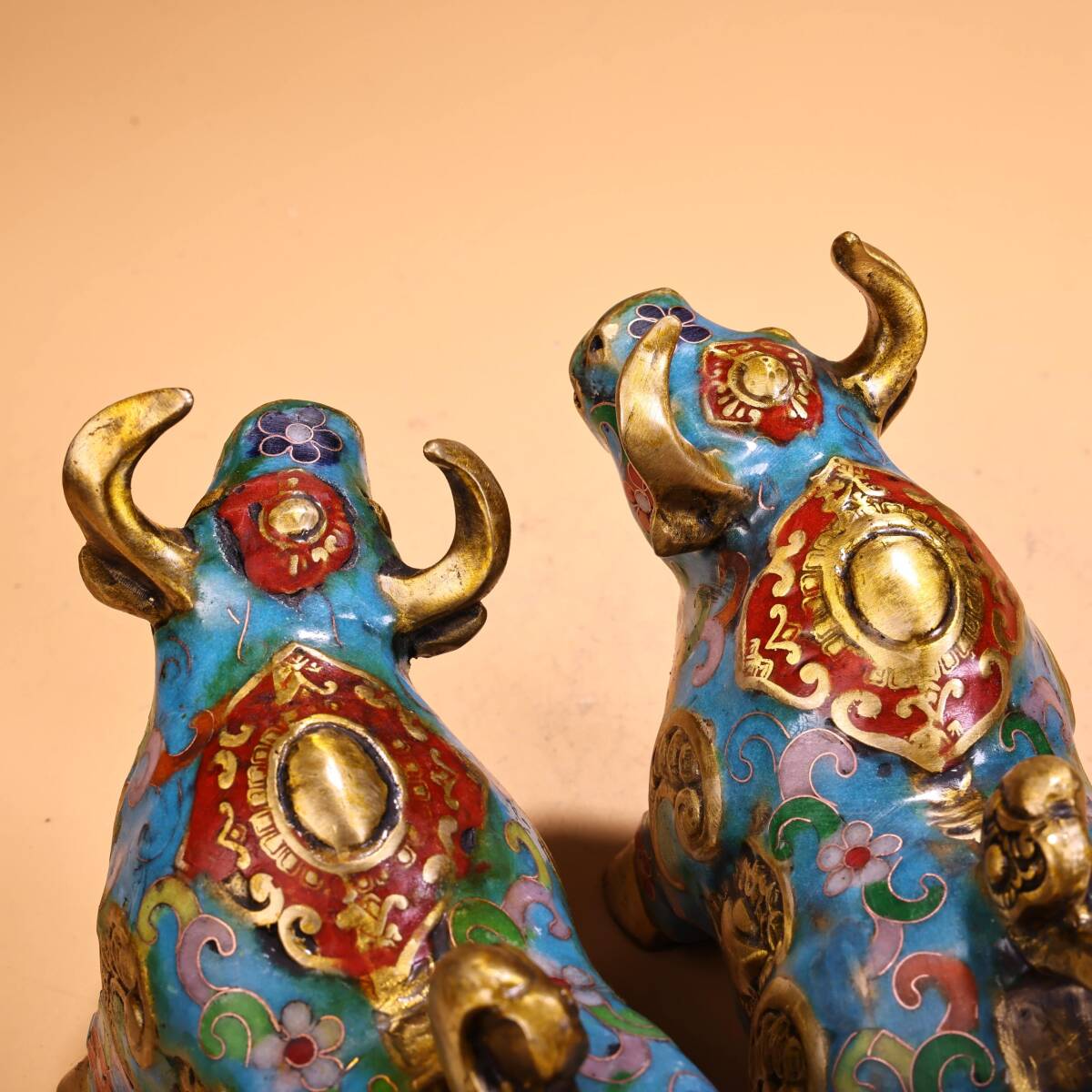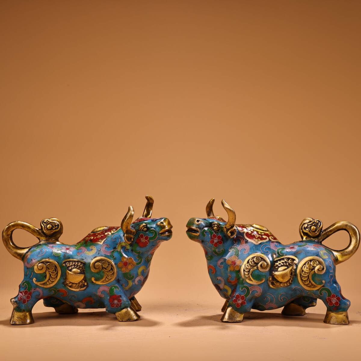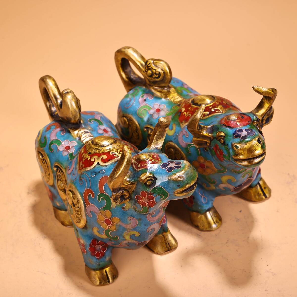 蔵友館蔵品 純銅彫 景泰藍琺瑯彩招財牛 文案置物 極細工 古賞物 古美味 中国唐物 東洋彫刻 時代物 骨董 中国古美術