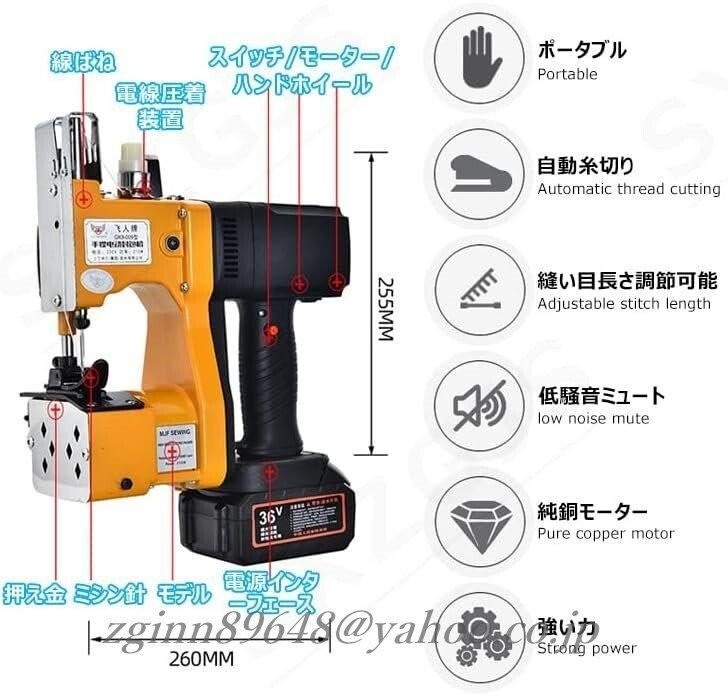 【大幅に効率アップ】210wのパワーで毎分1700針、1日5000袋も縫えるので、あっという間にたくさんの仕事が解決します。 純銅モーター、低騒音、低発熱、長寿命。 【ポータブル】: この電動ミシンにはリチウム電池2個と充電器が装備されています。 このオーバーロック ミシンはコードレスで、プラグを差し込む必要も、ワイヤー タイも必要ありません。 土のうアウトドアソーイングバッグに特に適しています。 【自動糸切り装置】糸を自動糸切り溝に引き込むと、ワイヤーが簡単に外れ、作業が途切れることなくスムーズに行えます。 慣れれば簡単にマスターでき、自動で糸切りができるので作業がスピードアップします。 【軽量片手操作】片手で操作できる軽量サイズ、シングルチェーンステッチで確実な縫製、ほどけやすいので開閉の多いストックバッグの管理に最適です。 縫製後の袋の中身を使用する場合は、糸の端を持って引っ張って袋口を緩めてください。 また、このバッグは後で再利用できます。 【適用範囲】宅配袋、米袋、クラフト紙袋、織袋、サックなどの縫製に使用できます。 ミシンシール機は、主に海運会社、大規模工場、倉庫に適しており、食品、化学薬品、塩、肥料などの包装に広く使用されています。