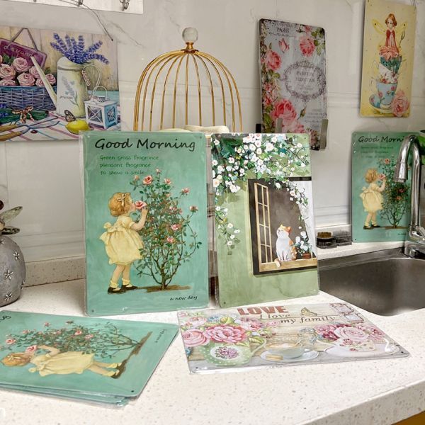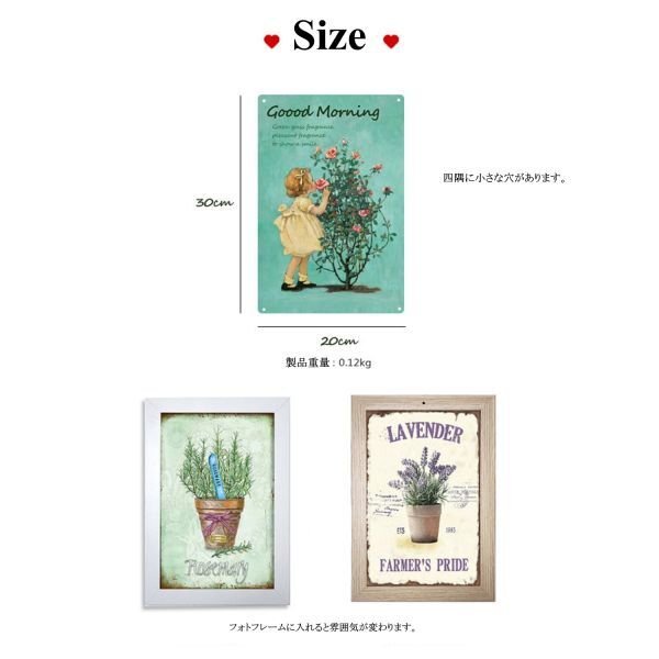 • ブリキ素材のアンティーク風ガーデニングプレート。綺麗な花や植物のまわりに掲げたり、店舗やお庭のアクセントとして壁に飾ったりしてみてください。