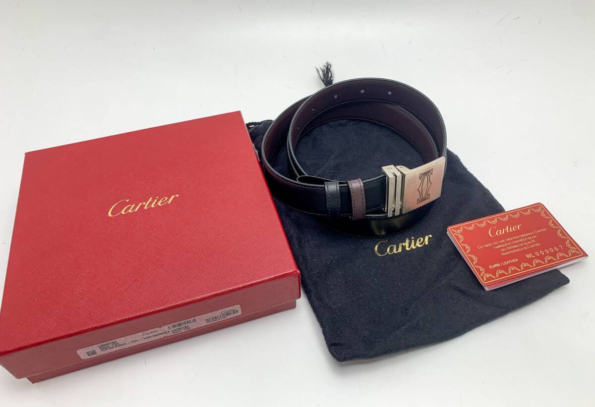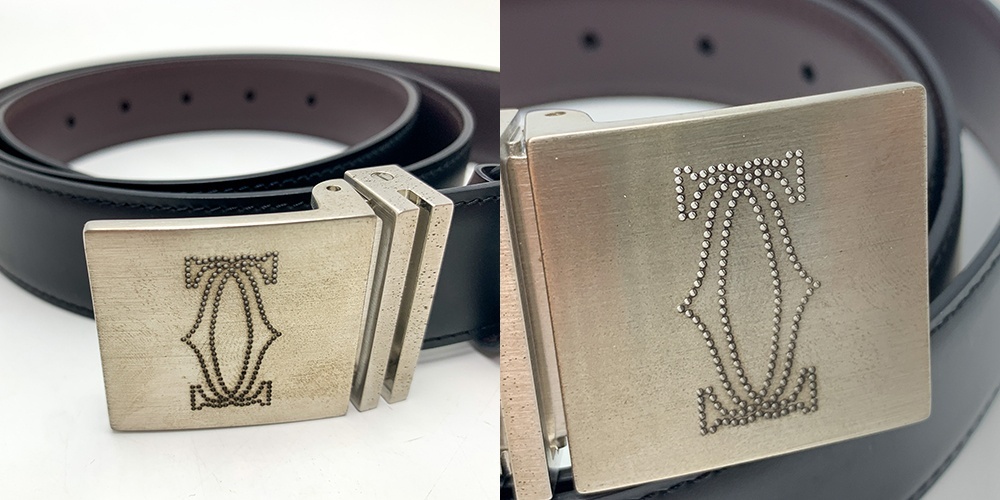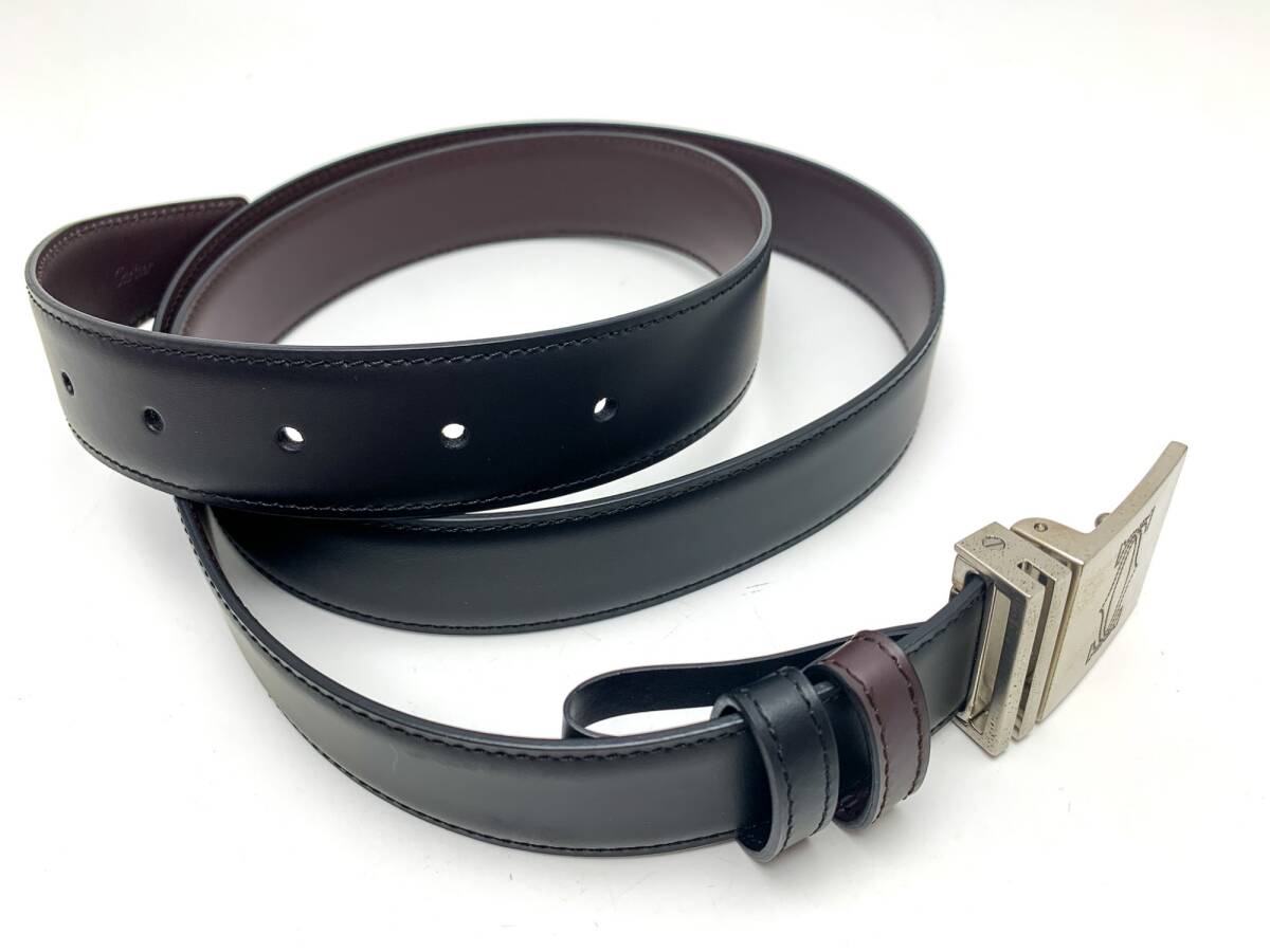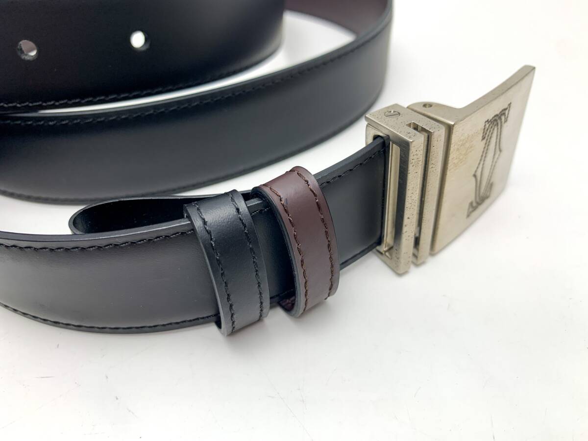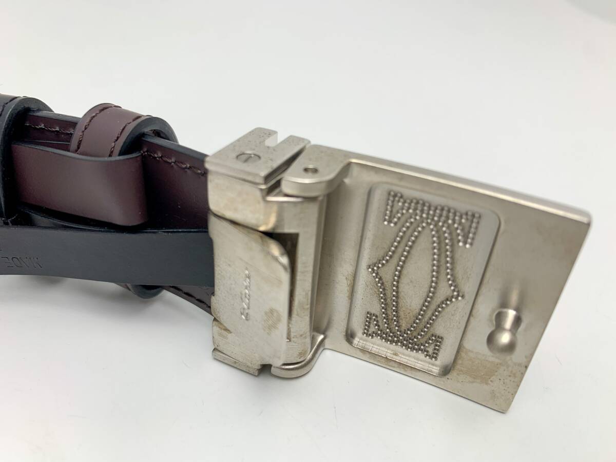| カルティエのベルトになります。バックルのマストがおしゃれな一品。ブラウン×ブラックのお色で、使いやすいです。Aランク。バックル部分に黒い斑点が少々ございますが、比較的綺麗なお品です。 | |