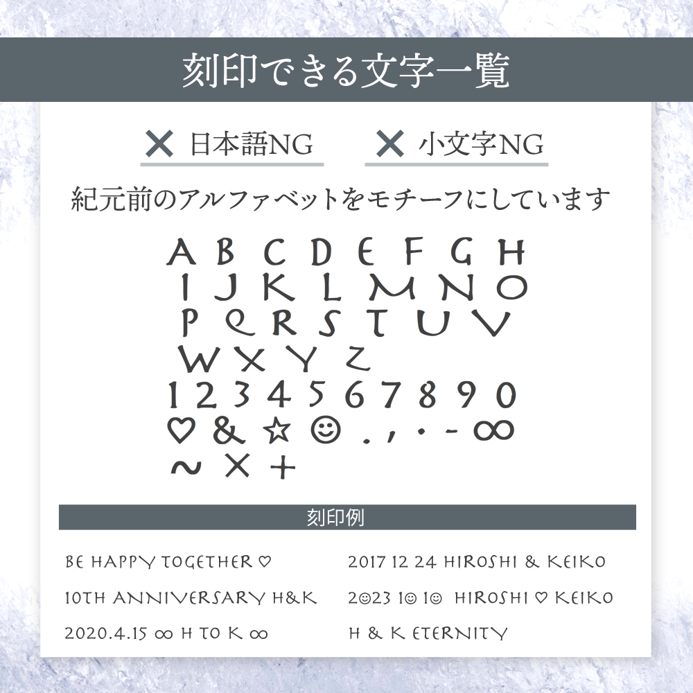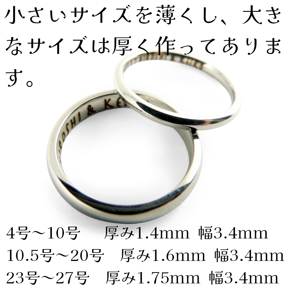 1個目は幅を広く、2個目は幅を狭くしたペアリング 一人の指に合わせると、もう一人には太めになったり、もう一人の指に合わせると一人には華奢に見えてしまったりするので、ペアリングですが幅を変えています。 1個目2個目ともに外側と内側に丸みをつけて指輪触りを良くしています。 1個目幅3.4mmリング 4号~10号 厚み1.4mm 幅3.4mm 10.5号~20号 厚み1.6mm 幅3.4mm 23号~27号 厚み1.75mm 幅3.4mm 小さいサイズを薄くし大きなサイズの厚く作ってあります。 2個目2.0mmリング 4号~10号 厚み1.40mm幅2.0mm 10.5号~22号 厚み1.60mm幅2.0mm 23号~27号 厚み1.75mm幅2.0mm 小さいサイズを薄くし大きなサイズの厚く作ってあります。 商品名:甲丸ペアリング 材質:TITANIUM 本数:2個 値段:3980円 送料:0円 箱:0円 刻印:0円 ご注文後、〈例〉の要領でご連絡ください。 ↓↓〈例〉 1個目幅3.4mmリング:〇号 2個目2.0mmリング:〇号 希望刻印:2017 12 24 HIROSI & KEIKO 箱の色:リボン 青箱 ↑↑ 刻印: 半角アルファベット大文字 OK 数字 OK 一覧表の記号 OK 日本語 NG お好きなサイズを4~27号の中から2サイズから選んでください。 在庫 有り:〇 無:× 4.0号〇 4.5号〇 5.0号〇 5.5号〇 6.0号〇 6.5号〇 7.0号〇 7.5号〇 8.0号〇 8.5号〇 9.0号〇 9.5号〇 10.0号〇 10.5号〇 11.0号〇 11.5号〇 12.0号〇 12.5号〇 13.0号〇 13.5号〇 14.0号〇 14.5号〇 15.0号〇 15.5号〇 16.0号〇 16.5号〇 17.0号〇 17.5号〇 18.0号〇 18.5号〇 19.0号〇 19.5号〇 20.0号〇 21.0号〇 22.0号〇 23.0号〇 24.0号〇 25.0号〇 26.0号〇 27.0号〇 指輪を入れる箱を1個お付けします。 お好きな箱をお選びください。 リボン 青箱 リボン ピンク箱 母の日ありがとう 青箱 母の日ありがとう ピンク箱 箱不要簡易包装 |