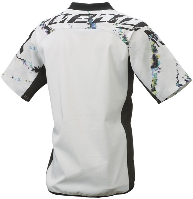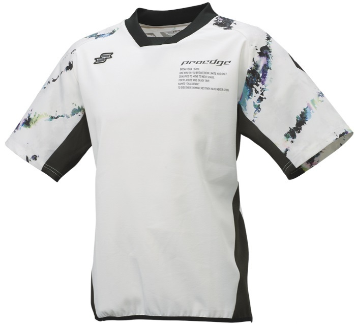 ●プロエッジトレーニングピステは練習や移動など、様々なシーンでの着用に適した半袖ピステ。裾はニットバインダー仕様でめくれ上がりにくくなっているため腰回りの収まりが良く、運動中の邪魔になりません。また襟元は多角形の形状にゴムを採用することで様々な方向に伸びやすく、引っ掛かりがちな頭回りもスムーズに脱着できる仕様です。肩から袖にかけてシーズングラフィックの「crack zebra」柄を施したほか、わきやさいどにらいんを入れすことでスタイリッシュに着こなすことができるデザインになっています。