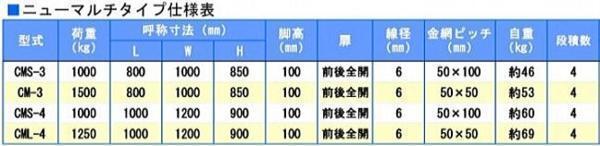 | 型式 | 荷重 (Kg) | 呼称寸法(mm) | 脚高 (mm) | 扉 | 線径 (mm) | 金網ピッチ (mm) | 自重 (kg) | ||