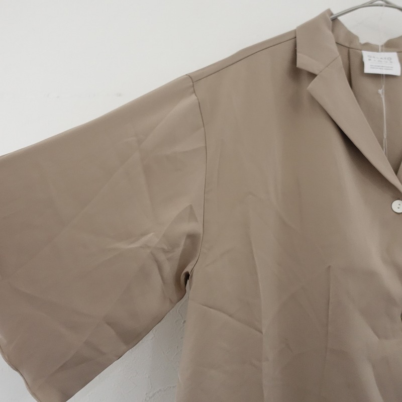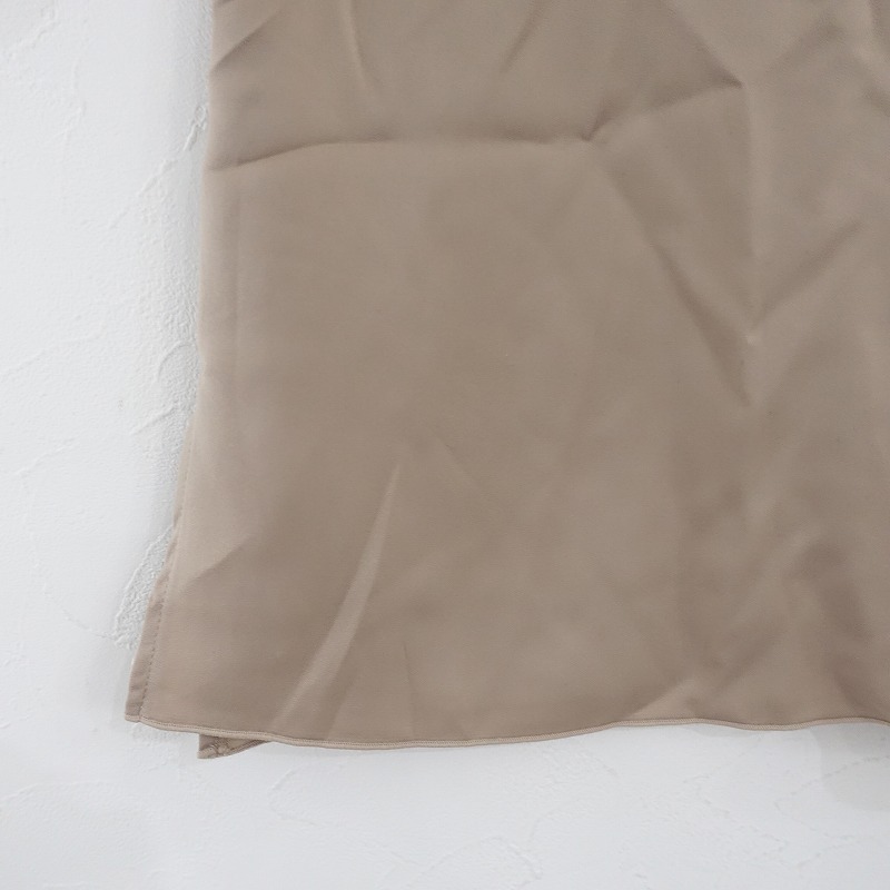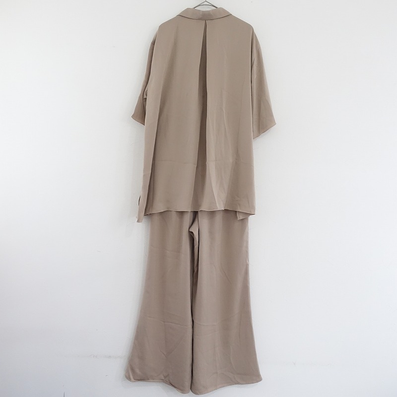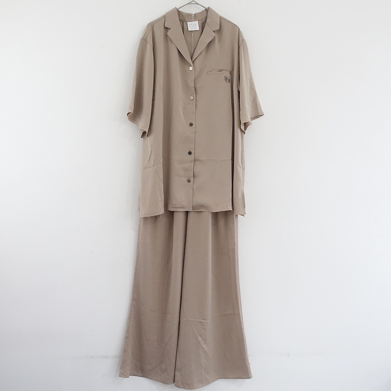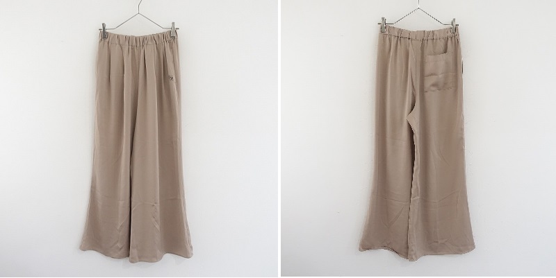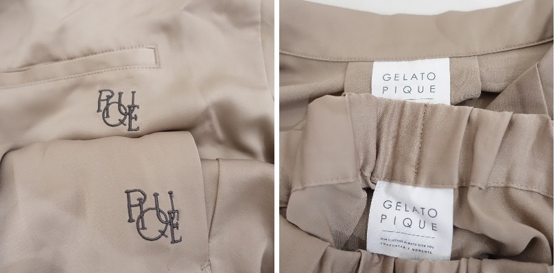 | gelato piqueのサテンシャツ サテンロングパンツです。カラーはベージュです。ポリエステル100%のシルキーな艶を配し、落ち感があるサテン生地を使用。トップはテーラードカラーで、バックはインバーテッドタックを寄せ、裾サイドはスリット入り、左胸にポケット、袖口と裾は巻きロック仕様です。パンツはウエストゴム入り、フロントは2タックを配し、右ヒップにパッチポケット、両サイドにシームポケットがございます。上下ともにブランドネームの刺しゅうがあしらわれております。 |