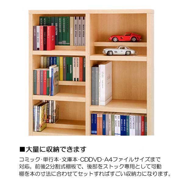 | 特徴 | ●コミック・単行本・文庫本・CD・DVD・A4ファイルまで対応。 ●前後2分割式棚板で、飾り棚として見やすく収納が出来ます。 ●前後棚板を揃えれば専門誌やA4サイズも収納できます。 ●引出し収納(チェスト)と連結したり、ロータイプを2段重ねて使用も可能。 ●日本製 |