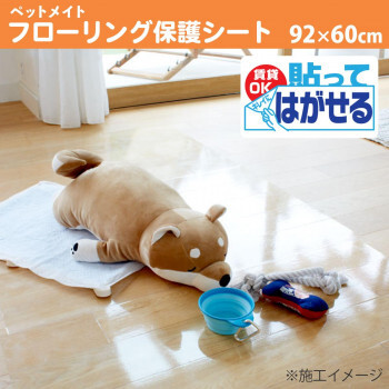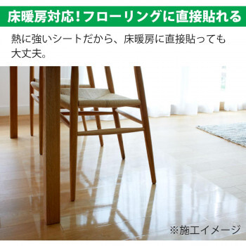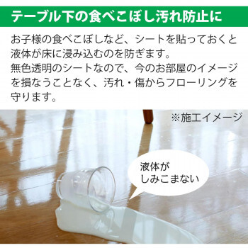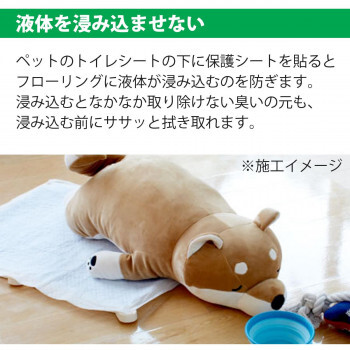 シートの特性でフローリングに液体が浸み込まず、モレ・ニオイ対策に効果があります。熱に強く、床暖房に直接貼っても大丈夫。透明のシートなので、今のお部屋の雰囲気を壊すことなく保護できます。裏紙に切れ目が入っているので簡単に取り付けられ、貼ってはがせる弱粘着タイプです。 |
