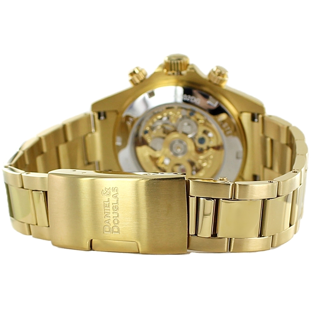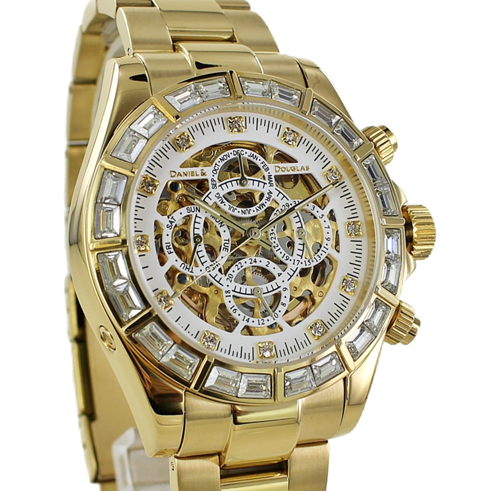 機械式独特の動きを目でも楽しめるスケルトン仕様のデザインです。計を着用したままでも裏からも自動巻きムーヴメントが確認できる両面スケルトンです。華やかなバケットダイヤが煌めき圧倒的な豪華さと存在感のある腕時計です。◎日常的に使える腕時計は贈り物にもおすすめです。■ブランド:DANIEL&DOUGLAS(ダニエル・アンド・ダグラス)■自動巻き/オートマチック(機械式自動巻)ゼンマイで時刻が可動する仕組み。装着して腕が動くことでゼンマイを巻き上げます。■電池交換について:オートマチックなので不要です。■防水性:日常生活防水■サイズ(約)時計の幅:40mm(リューズを含まず)ベルト腕周り:メンズスタンダード■ベルトカラー:ゴールド■ブランド専用BOX■保証期間:1年間DD8802DG-WH4男性向けギフト 男性向けプレゼント 彼氏 父親 男友達 職場の上司 退職祝い 結婚祝い 記念日ギフト 内祝い 就職祝い 還暦祝い 日常使い 高校生 社会人 20代 30代 40代 50代 60代 大学生 入学 卒業 入社 就職 転職 スーツ 紳士服 トノー型 うで時計 めんず