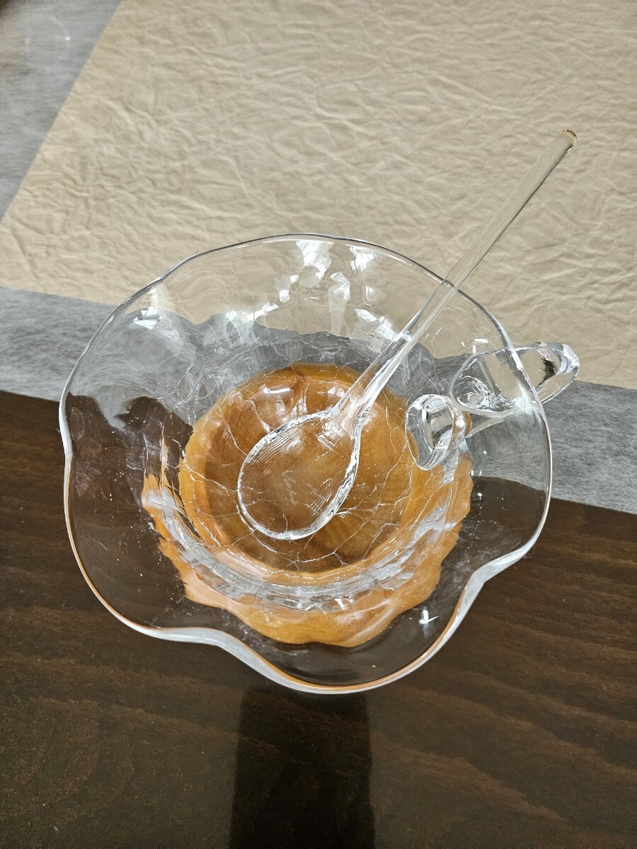 頂き物で使用せずショーケースに入れて保管しておりました。木製の台座とガラス製のスプーンも付いており非常に珍しいものです。素人採寸ですが、お皿が直径約13cm 深さ約6cm。木製台座の直径は約9cmほどです。なお、素人保管であり神経質な方の入札はご遠慮ください。また、ノークレームノーリターンでお願いします。