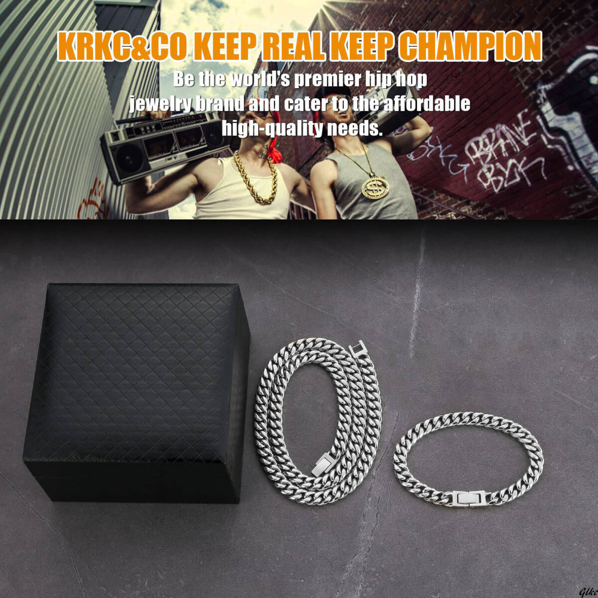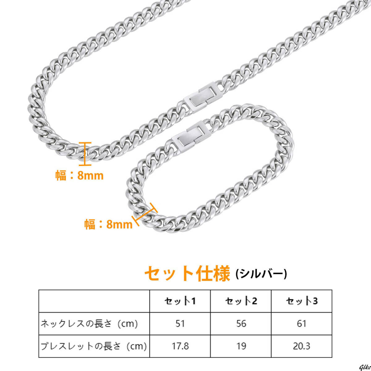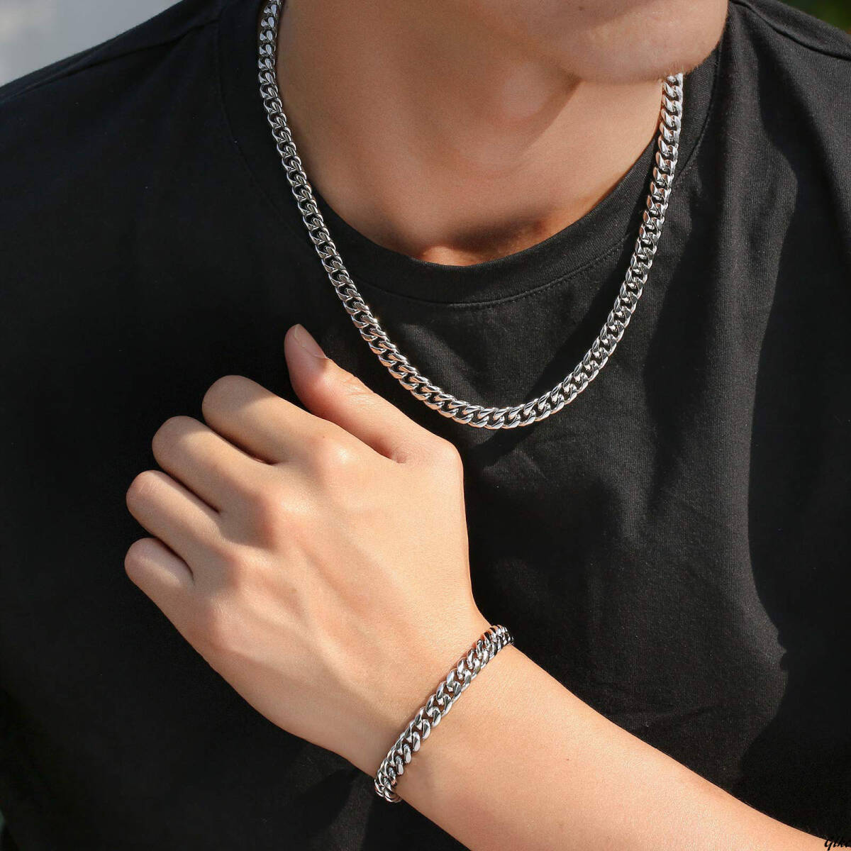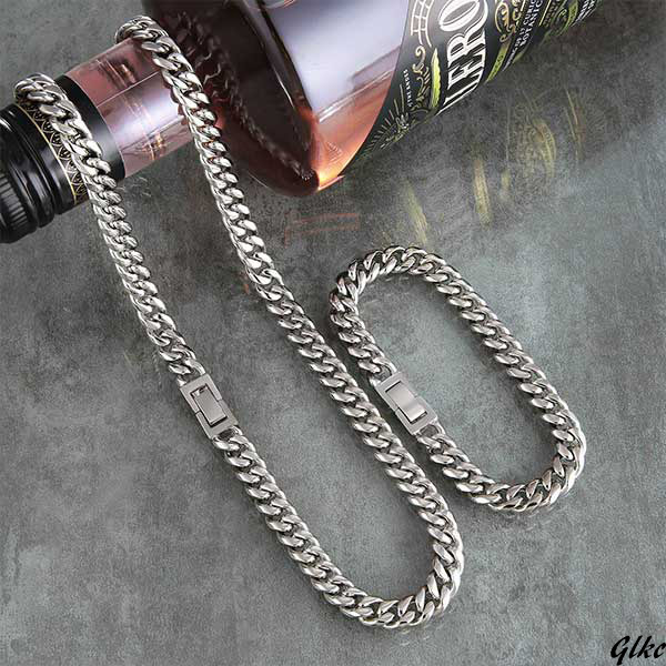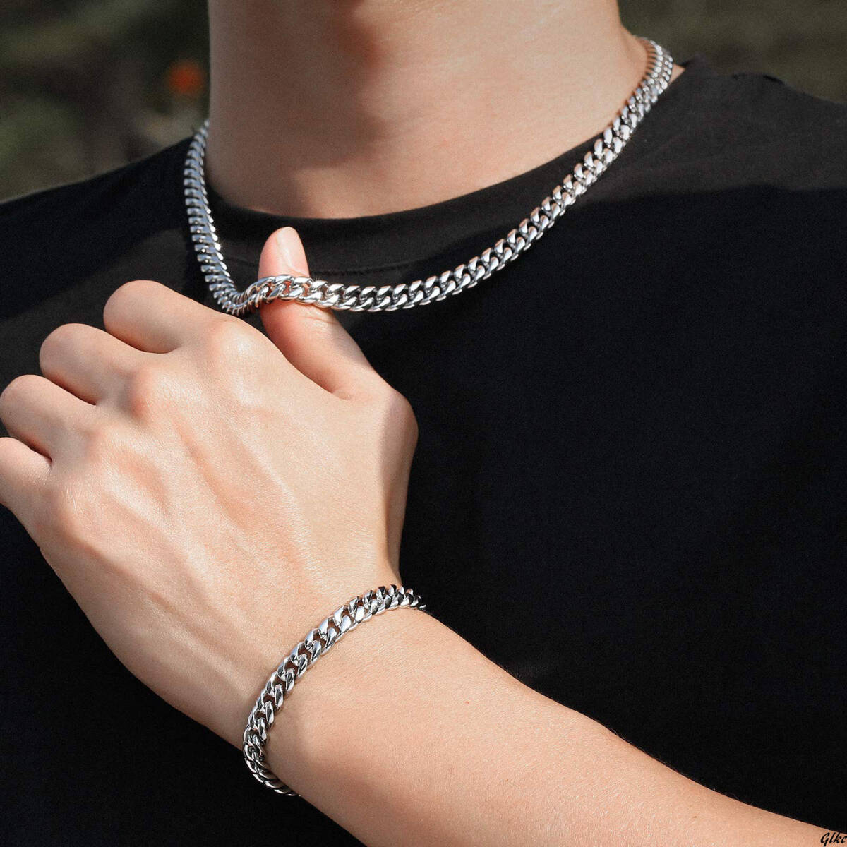 ネックレスとブレスレットがセットになった、幅8mmのマイアミキューバンチェーンアクセサリー。