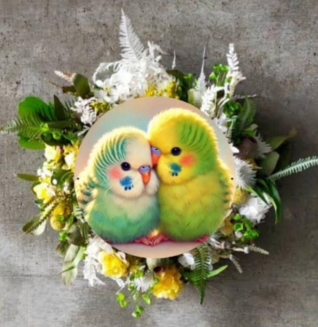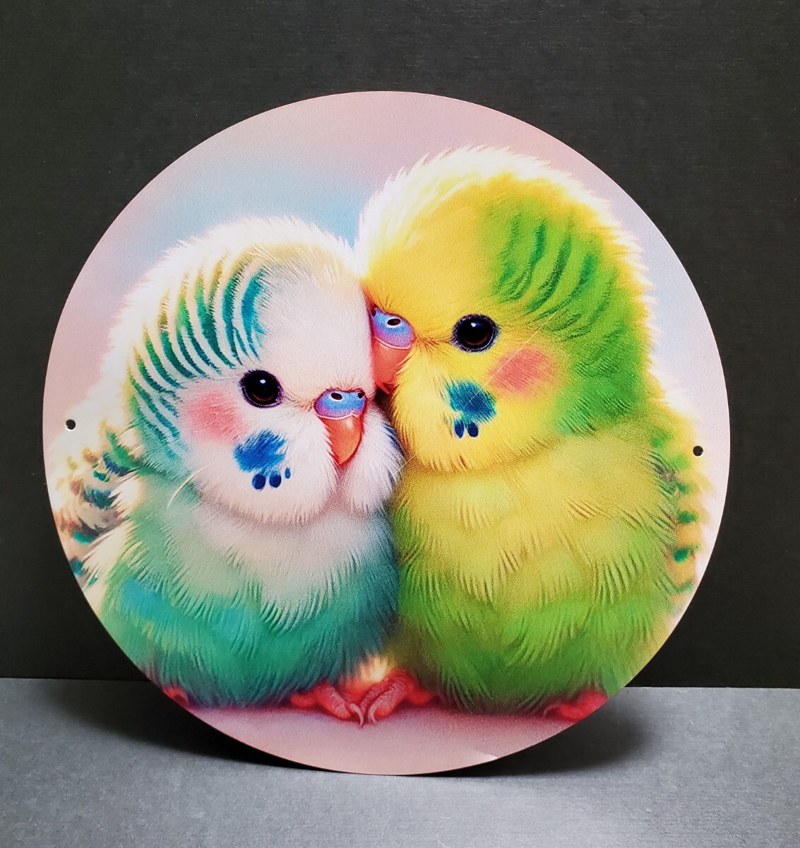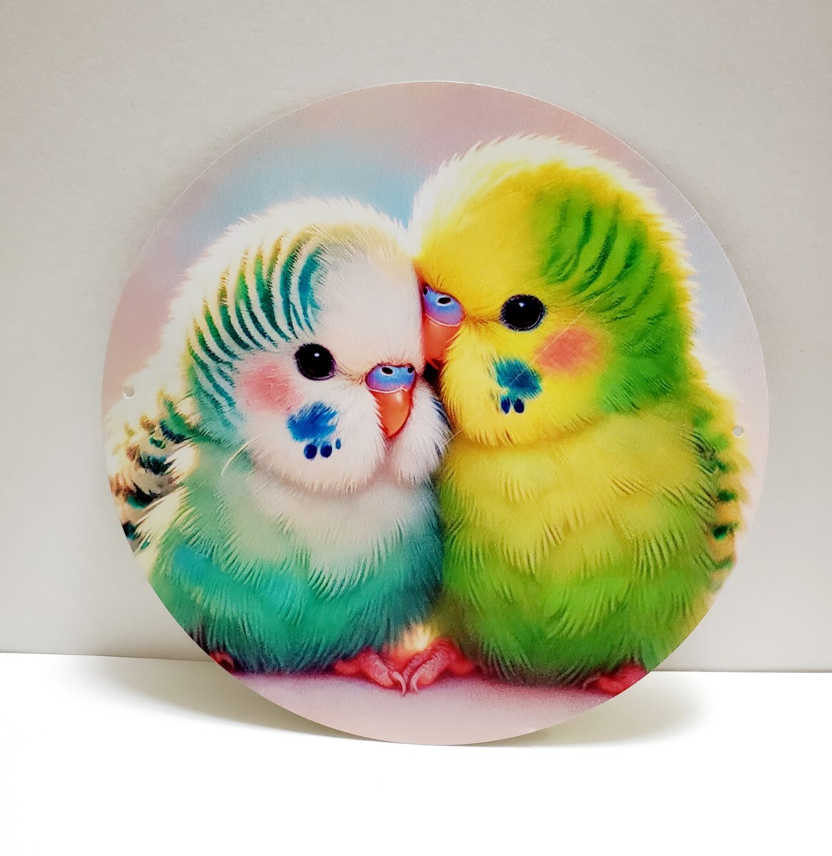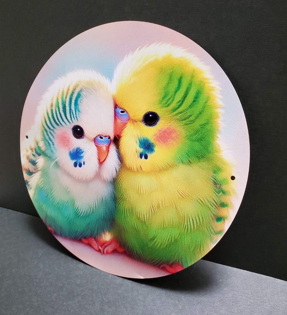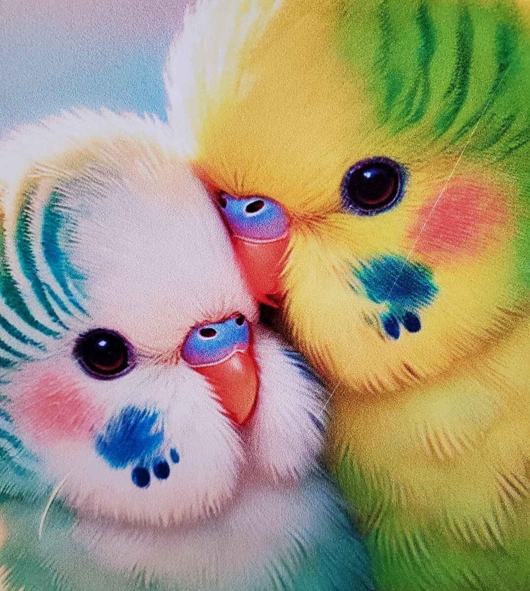 右側のインコに微かな斜めの線が入っています。