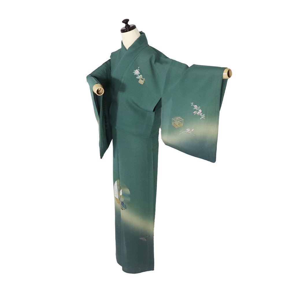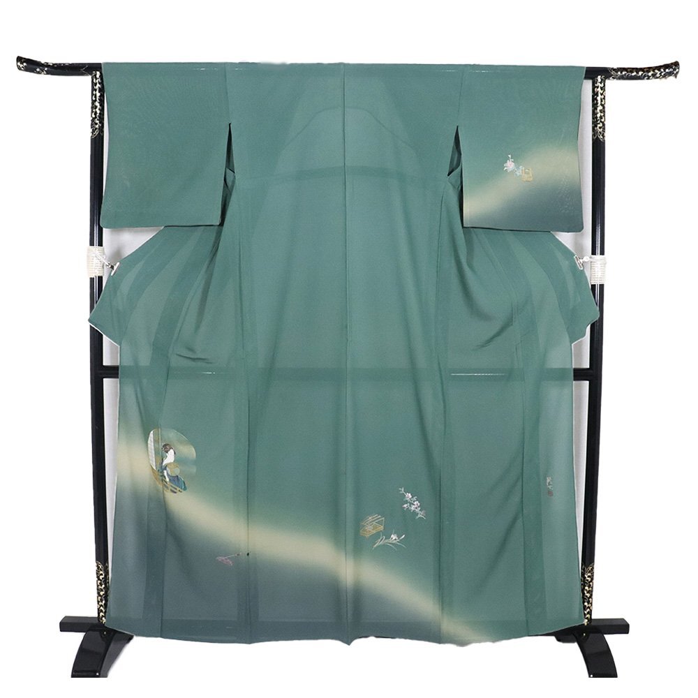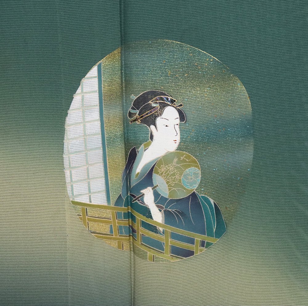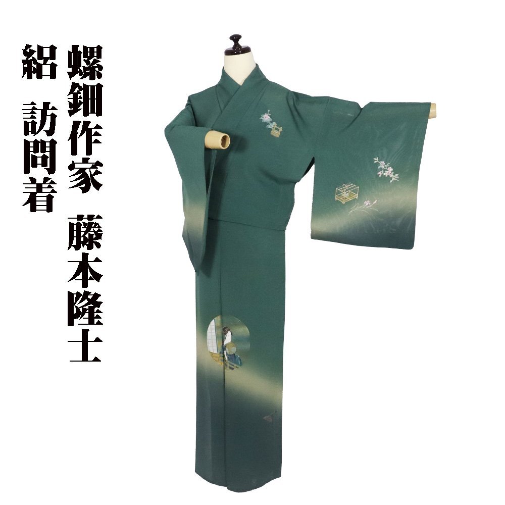 | 螺鈿作家 藤本隆士氏作 絽 訪問着 丹後縮緬地 緑(天鷲絨色)・ベージュ暈し地 芸者 螺鈿入り 月窓・花柄 168 広襟 作家落款入り | |